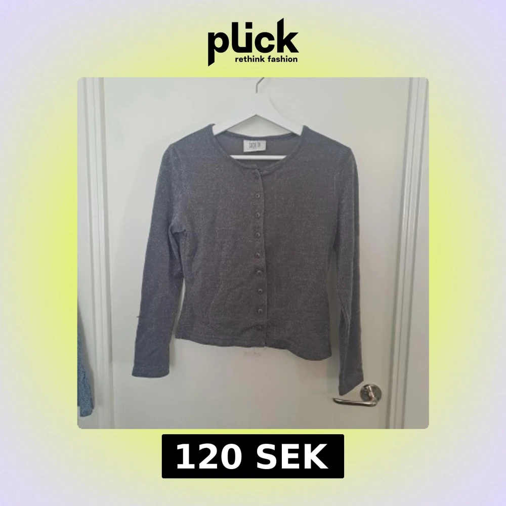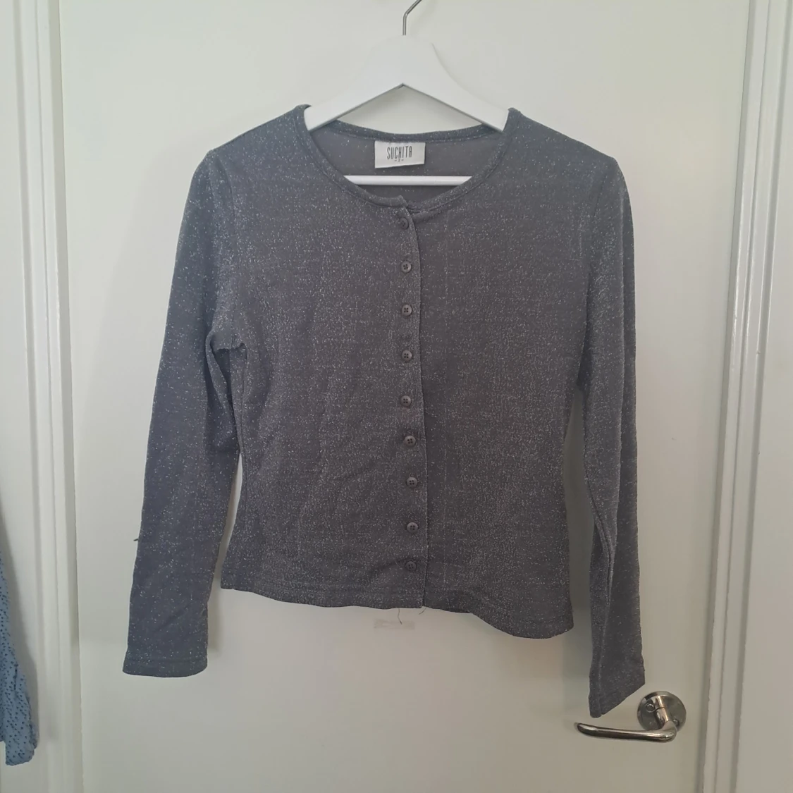 Grå långärmad topp från Suchita med glittrigt lurex-tyg och rund hals. Knappar framtill. Materialet är 83% nylon och 17%. 🩷