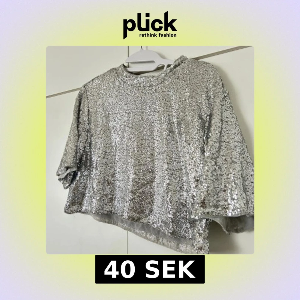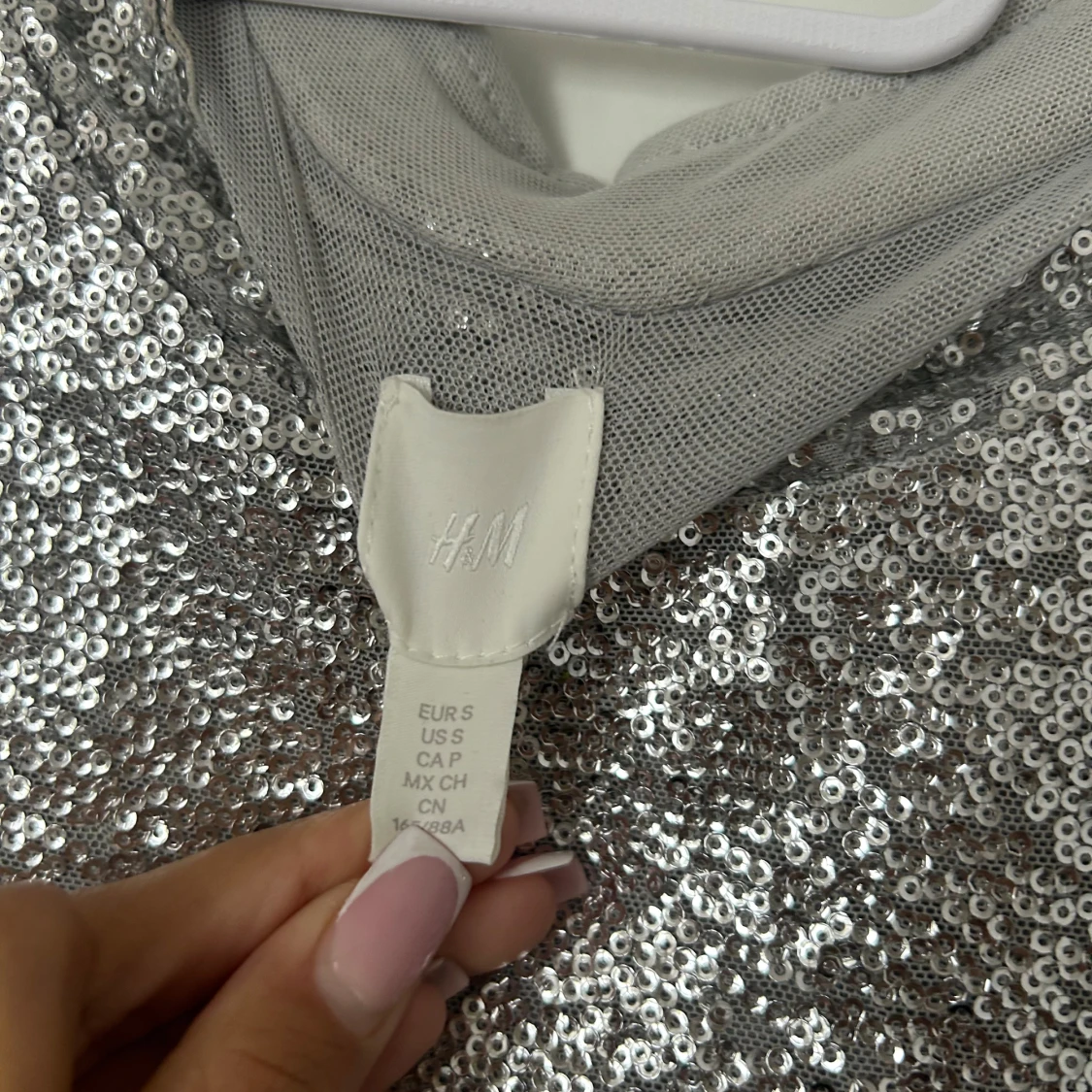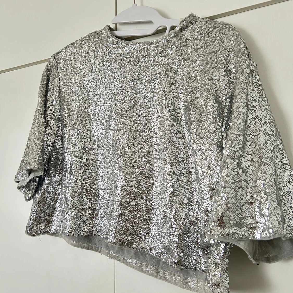 Säljer en glittrig silver topp från H&M, täckt med paljetter för maxad partykänsla. Modellen är croppad med korta ärmar och rund halsringning. Perfekt för dig som vill sticka ut och glänsa på nästa event!