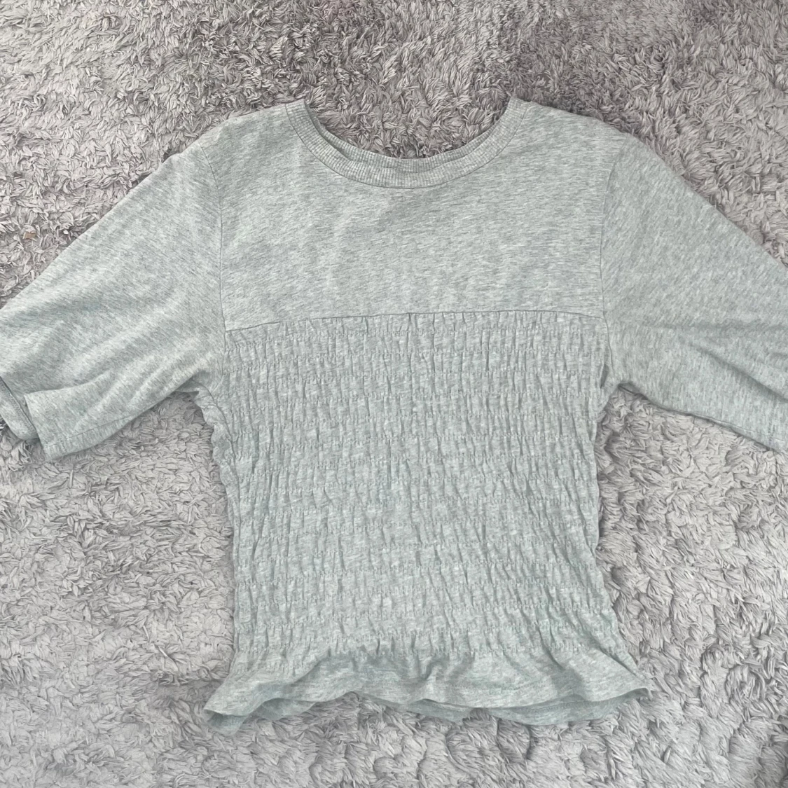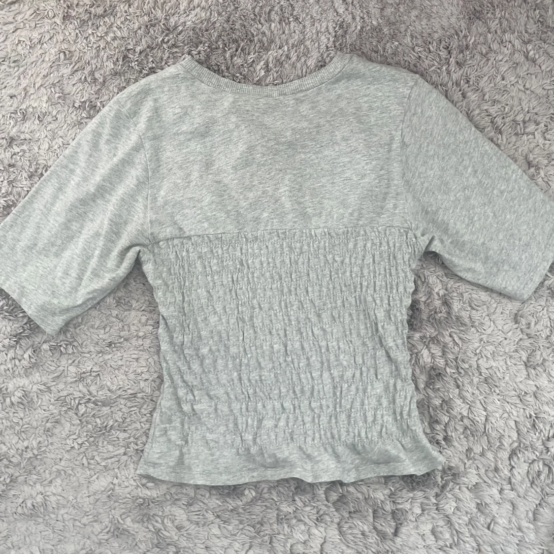 Superfin ljusgrå topp från H&M med smockad midja och lätt croppad passform. Säljer eftersom den inte används