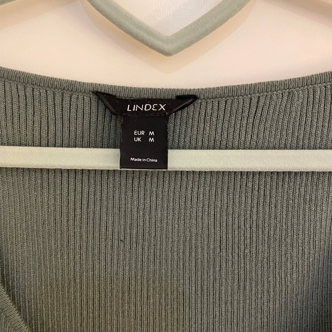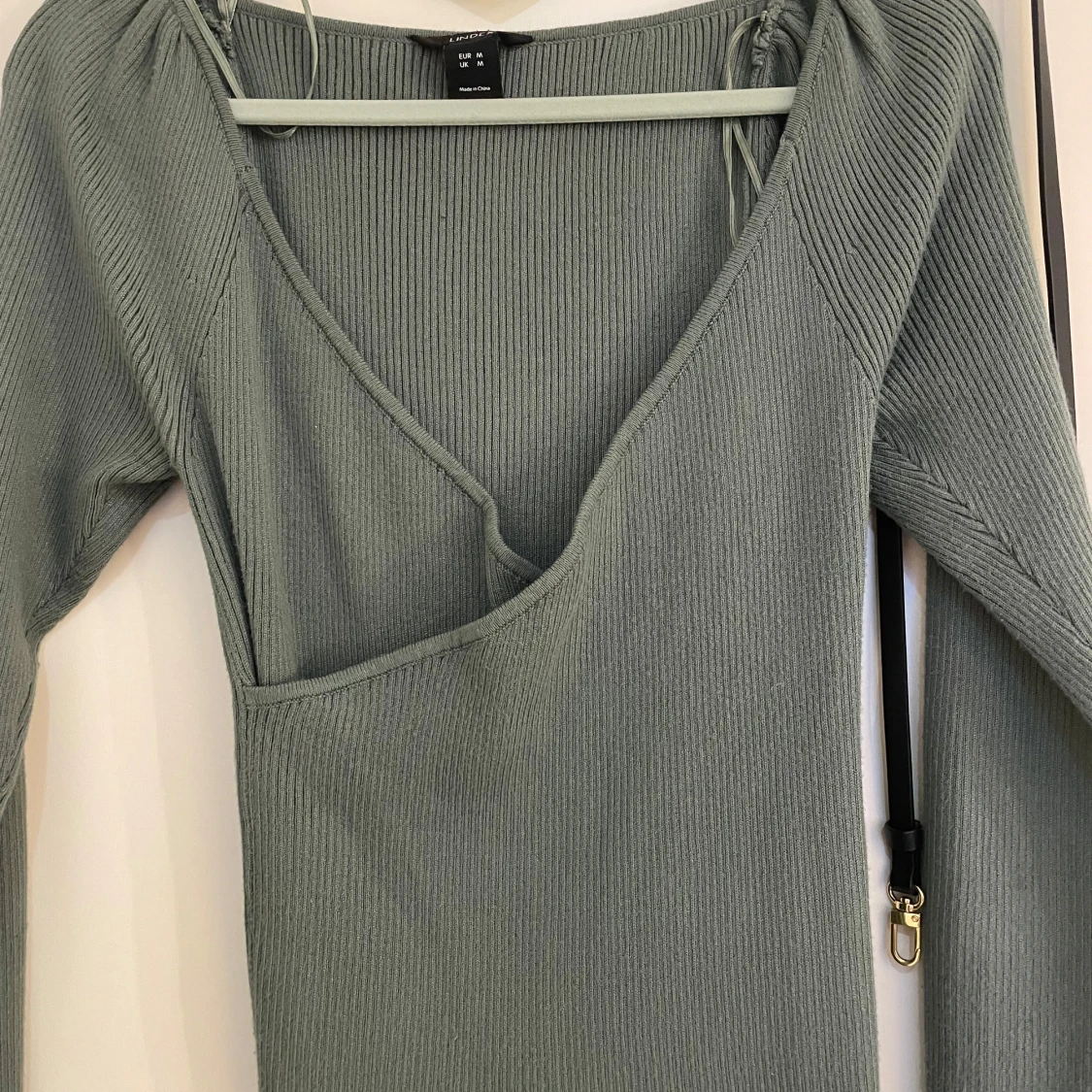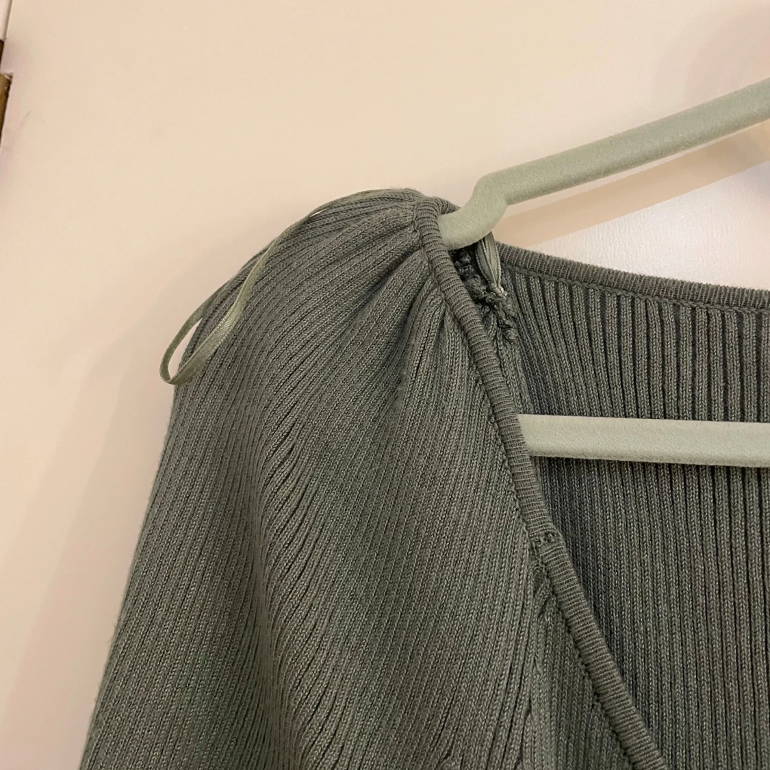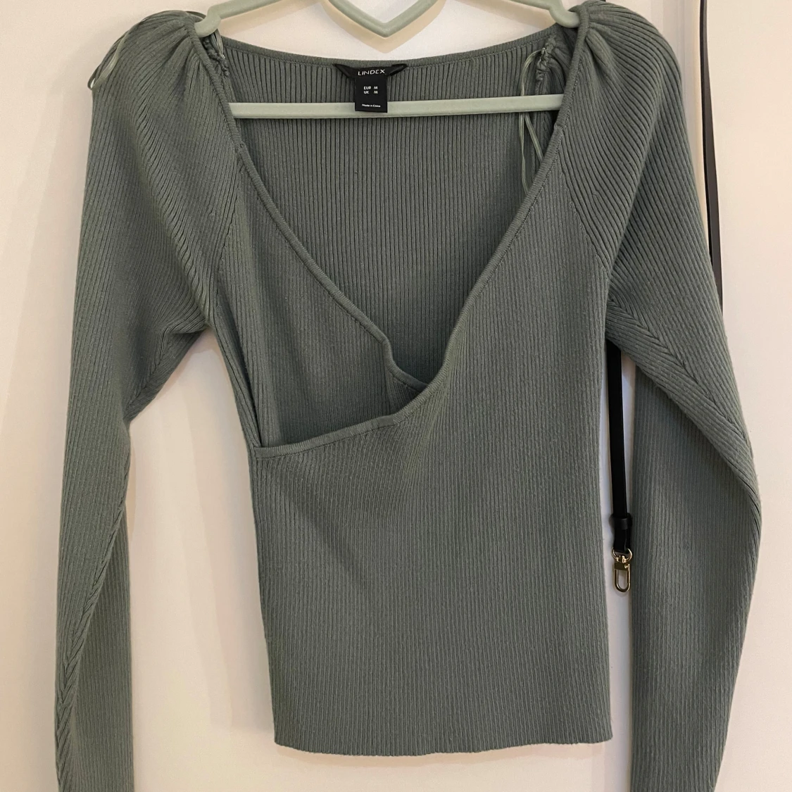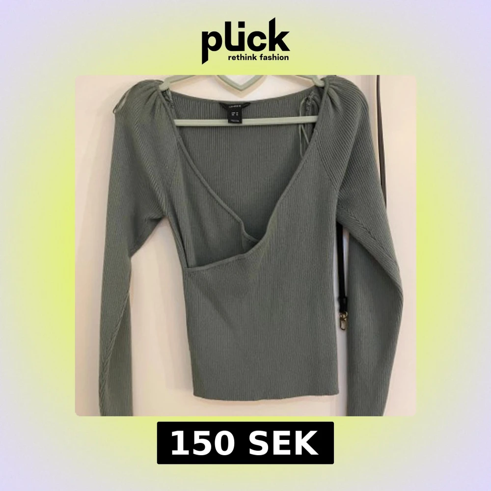 Snygg grön ribbad topp från Lindex med långärmad design och v-ringning. Toppen har en unik asymmetrisk skärning och knytning vid axlarna för extra stil. Perfekt för att lägga till en touch av elegans till din garderob.