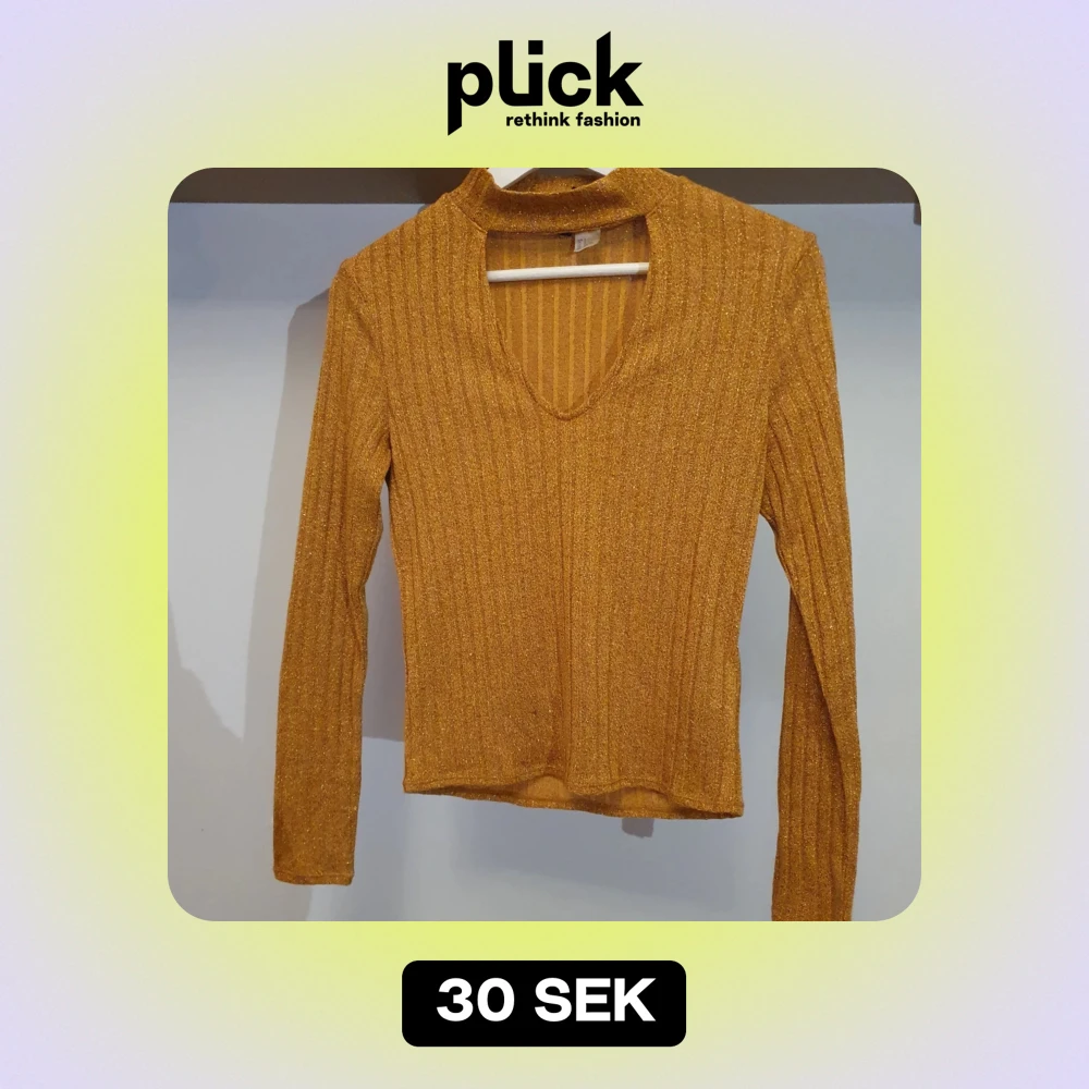 Säljer en superfin långärmad guldglittrig tröja i storlek S. Den är ribbad och har en snygg v-ringning som passar perfekt till festliga tillfällen. Perfekt topp för att glittra lite extra på vinterns alla festliga tillfällen! ✨