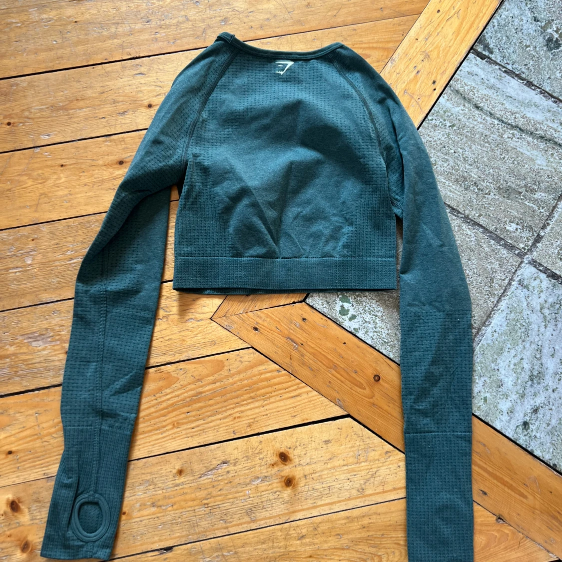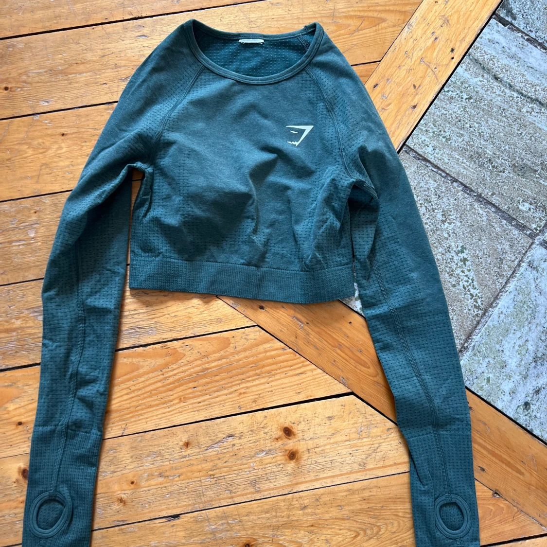 Träningstopp från gymshark. Grön färg och den är croppad med långa ärmar och hål för tummarna. Fint skick! Storlek XS men lapparna är bortklippta. Från Vital Seamless kollektionen.