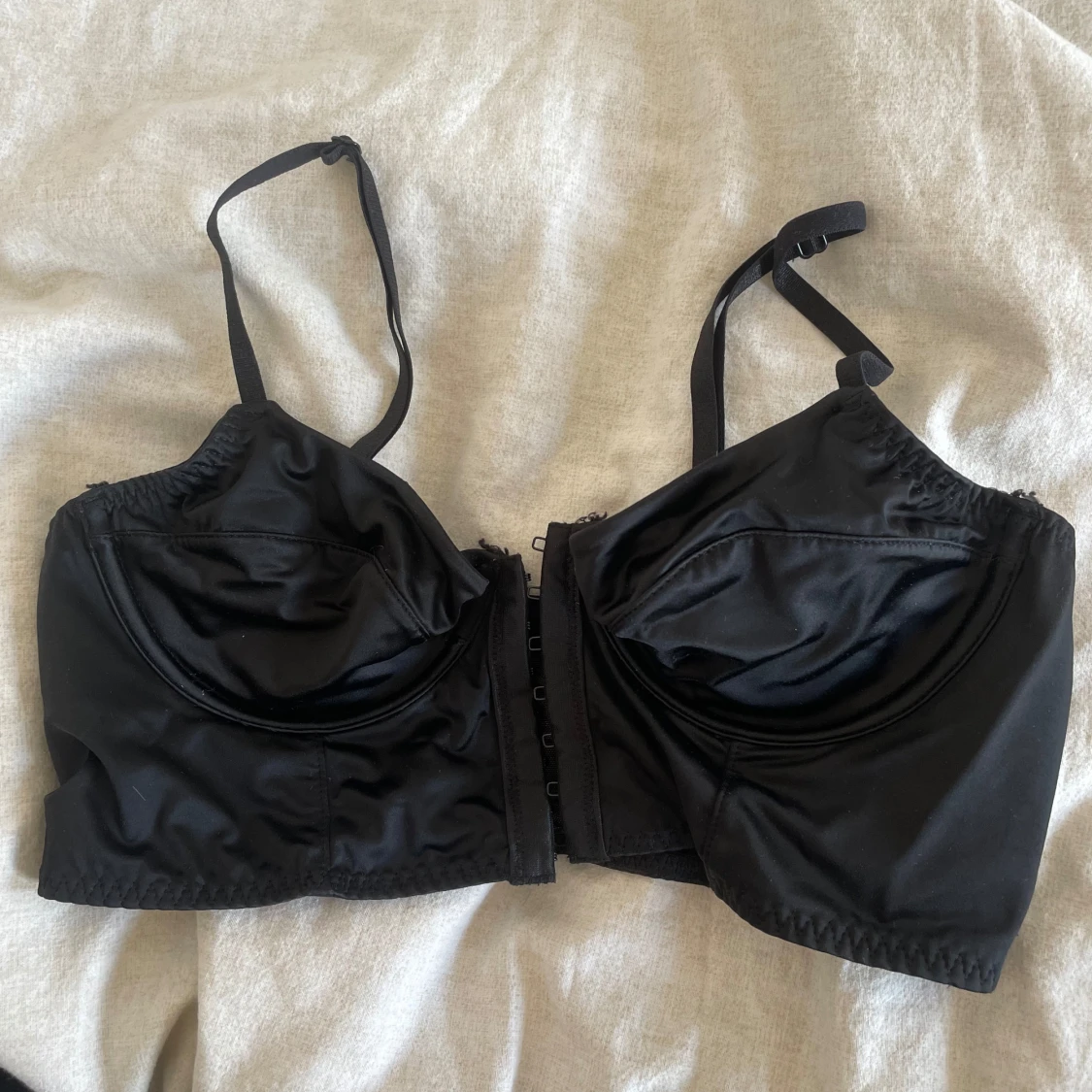 Snygg svart korsettopp från H&M med justerbara axelband och hakknäppning framtill. Gjord i glansig polyamid och elastan för en tight och bekväm passform. Perfekt att styla med höga jeans eller kjol för en cool look.