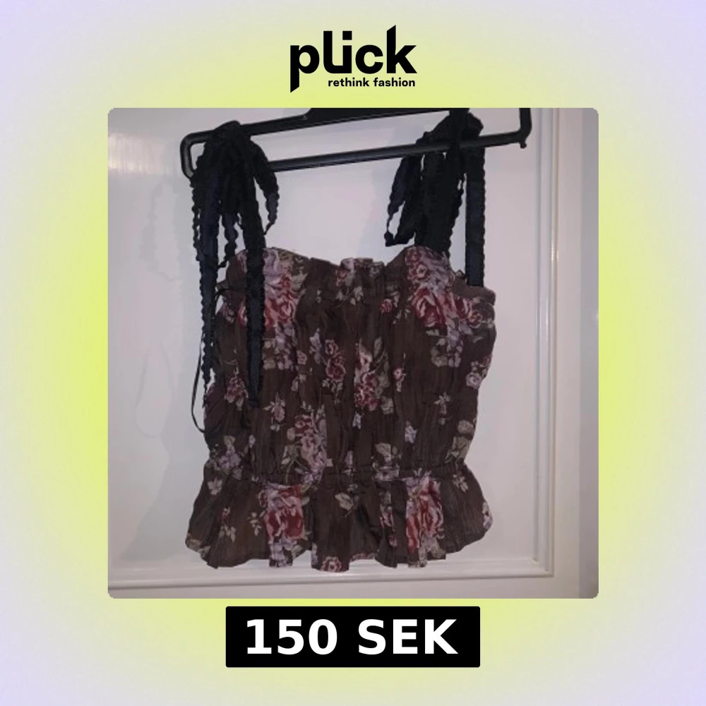 Supersöt brun linnetopp från Brock Collection x H&M med blommigt mönster i rosa och lila toner. Toppen har volang nertill och breda axelband i svart. Perfekt för sommardagar och ger en romantisk vibe.