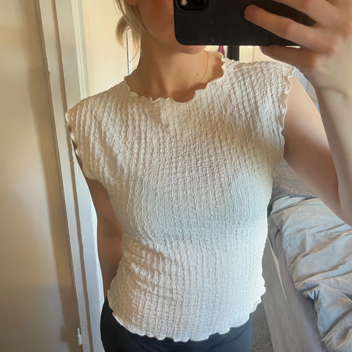 Säljer en stilren creme vit topp med en tight passform. Toppen är ärmlös och har en texturerad yta som ger en unik look. Perfekt för att matcha med både jeans och kjol.