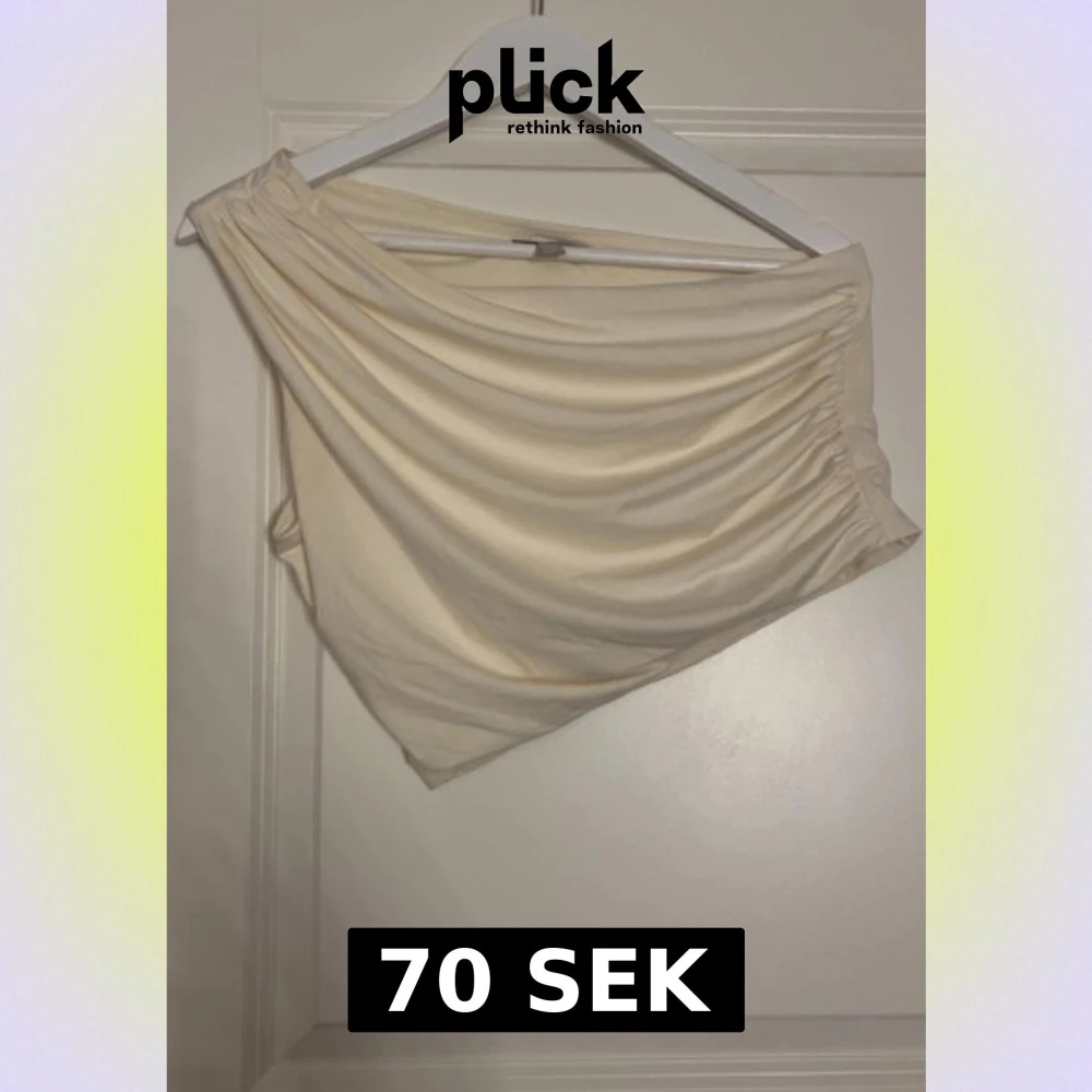Säljer en beige oneshoulder topp med snygg drapering och rynkade detaljer längs ena sidan. Toppen är axelbandslös på ena axeln och har en cool asymmetrisk form som ger en trendig vibe. Perfekt för dig som gillar stilrena och moderna plagg.