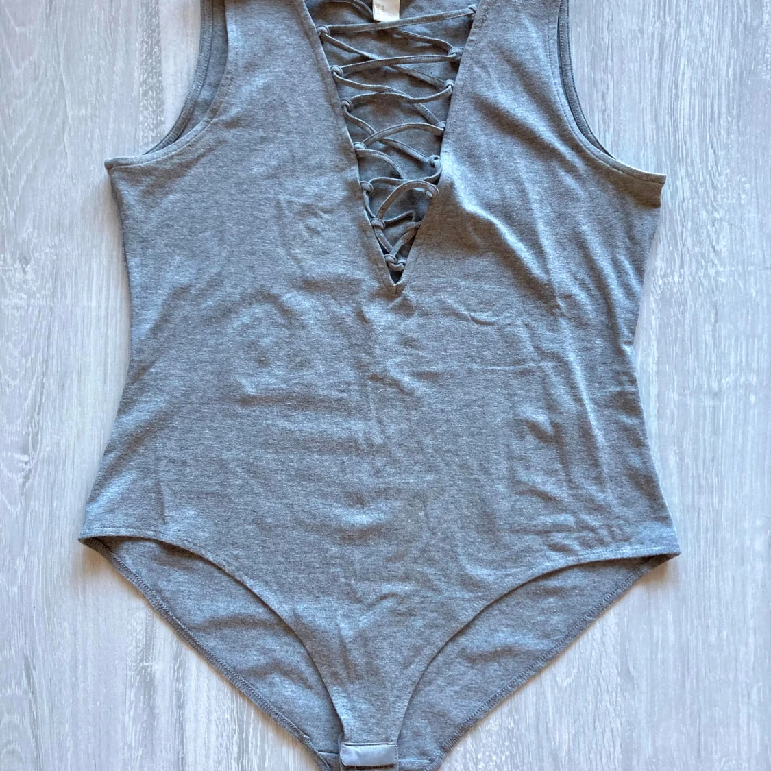 Säljer en grå bodysuit från H&M med snygg snörning framtill i v-ringad stil. Ärmlös modell i mjuk bomullsmix, perfekt för lager-på-lager eller som statement-piece.