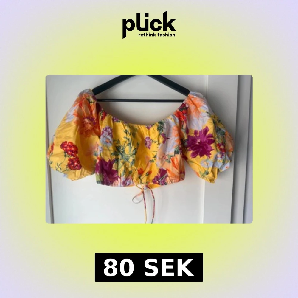 Färgglad croppad topp från H&M med blommigt mönster i gult, lila, rött och orange. Toppen har puffiga offshoulder-ärmar och knytning i midjan. Perfekt för dig som vill sticka ut med en somrig vibe och älskar voluminösa ärmar.