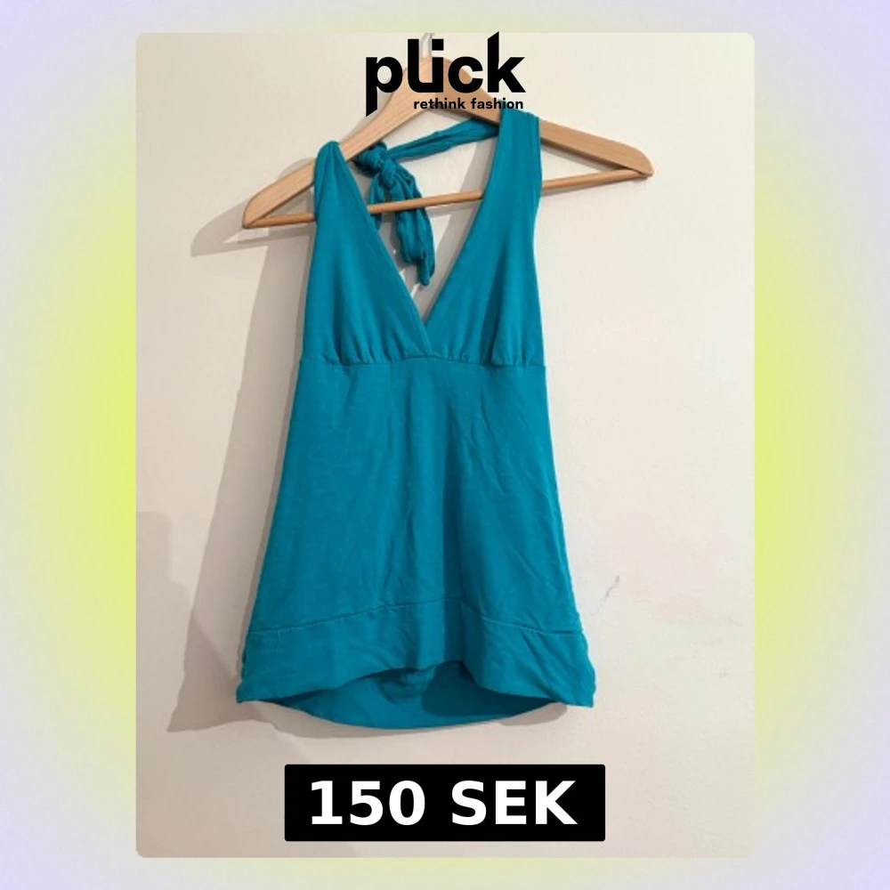 Turkos linnetopp från H&M i storlek M. Toppen har djup v-ringning och knyt i nacken för en snygg halterneck-look. Tillverkad i mjuk bomull, perfekt för varma dagar. Stilren och enkel design med bredare kant nedtill.