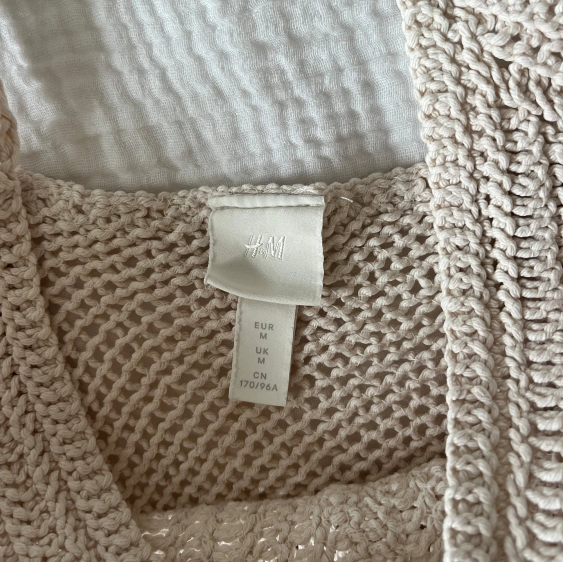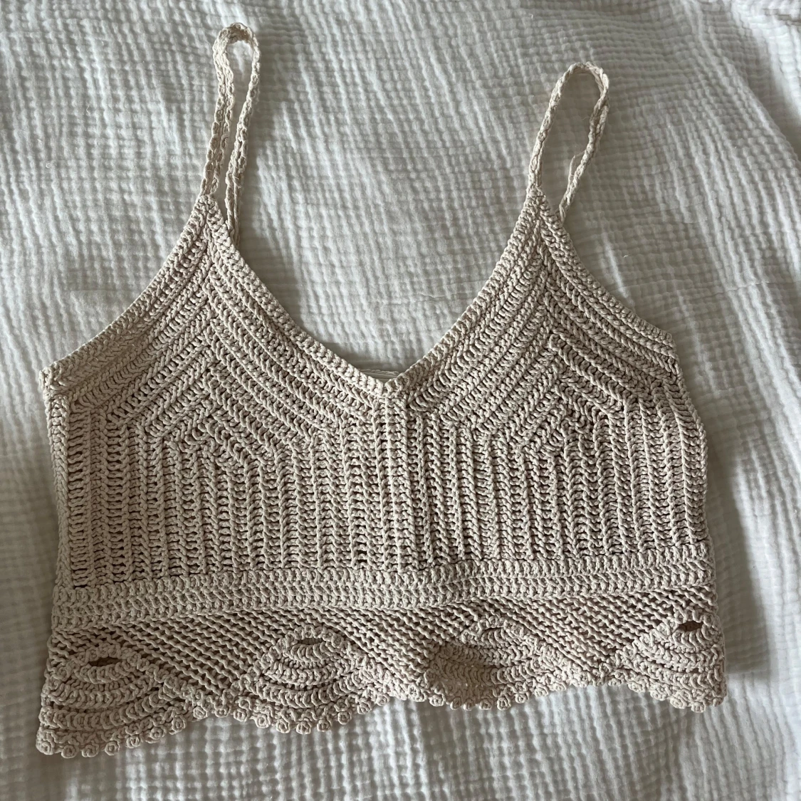 Superfin beige virkad linnetopp från H&M med smala axelband och v-ringning. Toppen är croppad och har ett snyggt mönster med vågig kant nertill.
