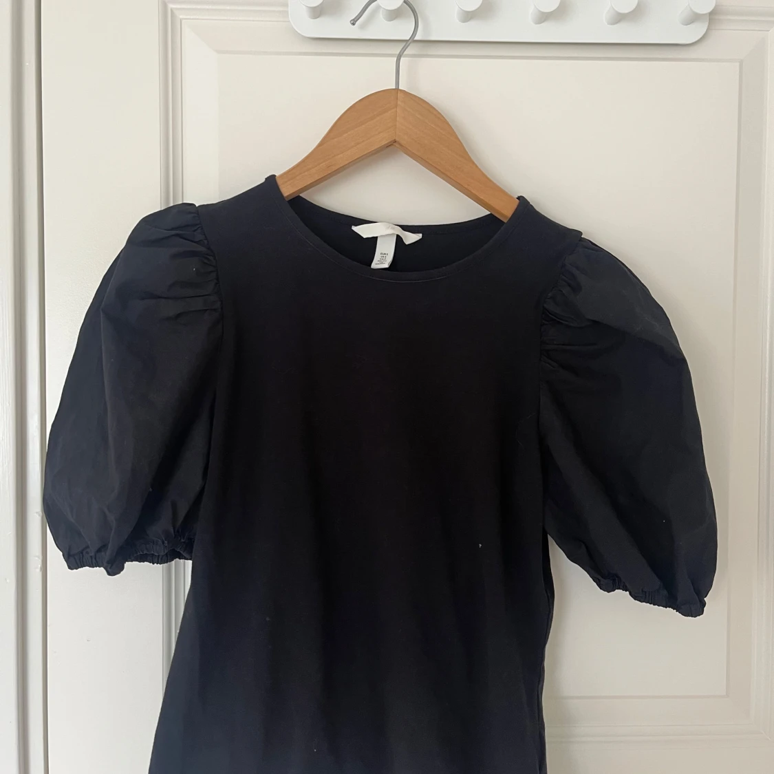 Säljer en svart topp med rund halsringning och trendiga puffärmar. Toppen har en enkel design men de voluminösa ärmarna ger en snygg statement-look. Perfekt att styla till både jeans och kjol.
