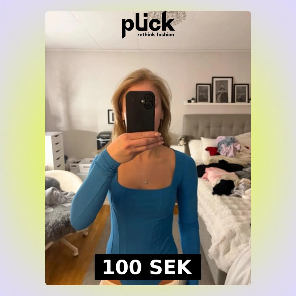 Säljer en blå långärmad bodysuit från H&M med fyrkantig urringning och figurnära passform. Toppen är tillverkad i mjuk bomull och har sömmar som ger en snygg detalj. Aldrig använt.