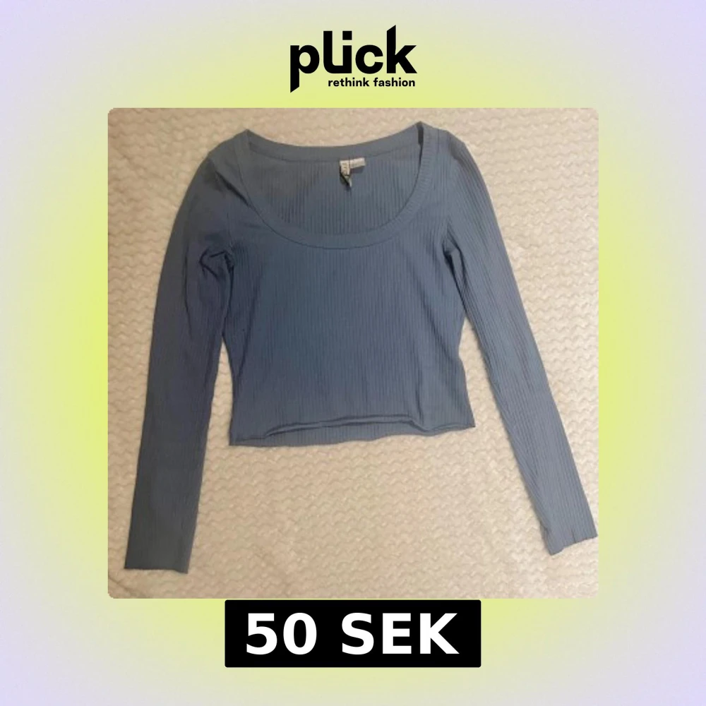 Säljer en ljusblå ribbad topp från H&M med lång ärm och rundad urringning. Toppen är croppad och har en slim passform som sitter snyggt på kroppen. Perfekt att styla med jeans eller kjol för en trendig look.