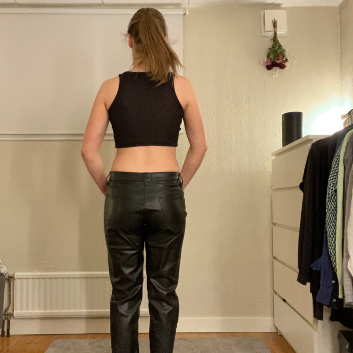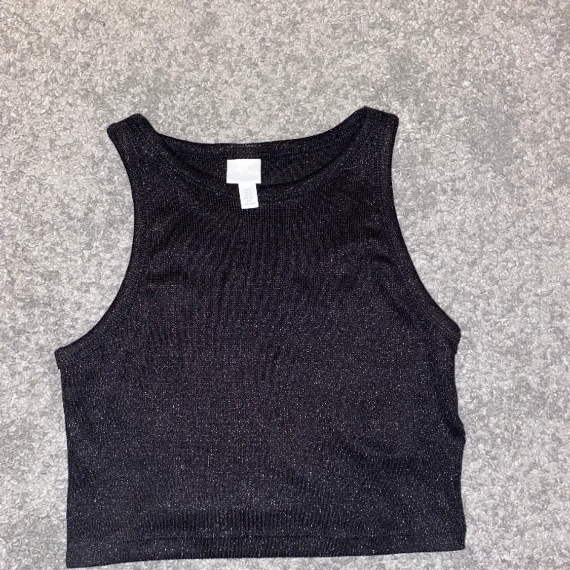 Denna topp är kroppad och glittrig (syns inte så tydligt om det inte lyser på den med t.ex ficklampa) Den är storlek S och inte så använd men den har ett litet hål på sidan men det är nog inga problem att sy ihop om man har material.