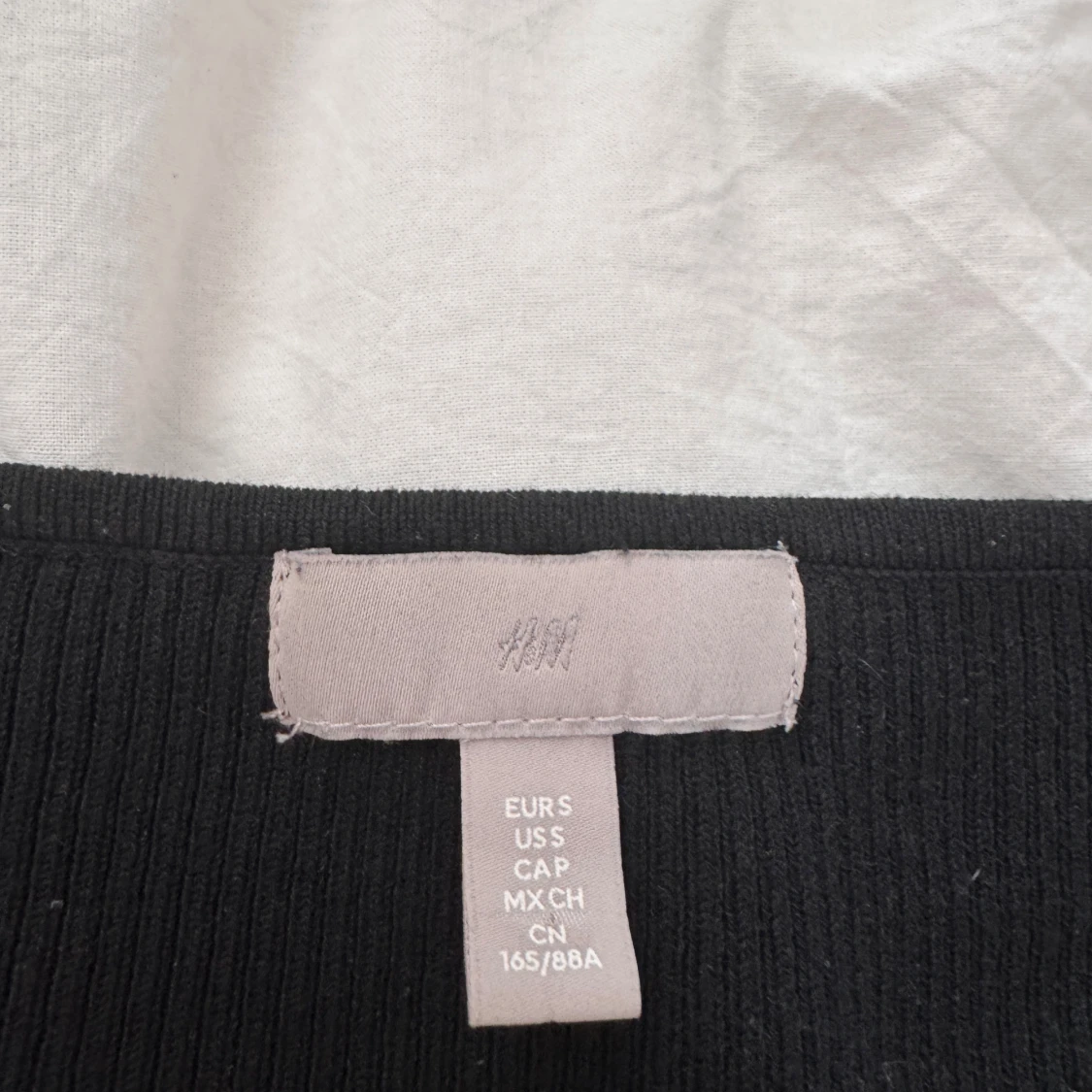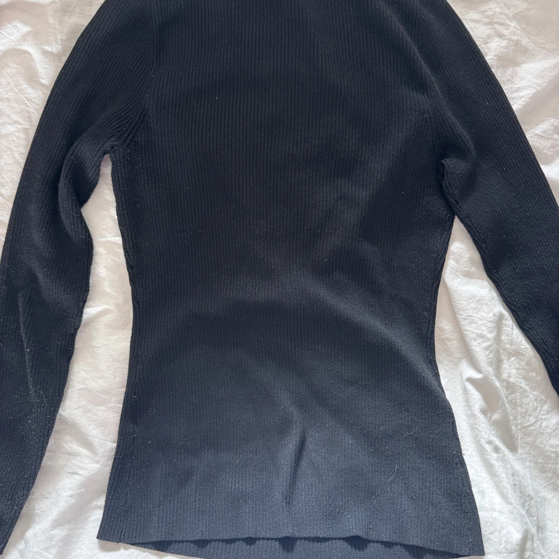 Svart långärmad topp från H&M med ribbad struktur och snygg fyrkantig urringning. Modellen är figurnära och har en v-ringad detalj framtill som ger en modern vibe. Perfekt att styla med jeans eller kjol för en clean look.