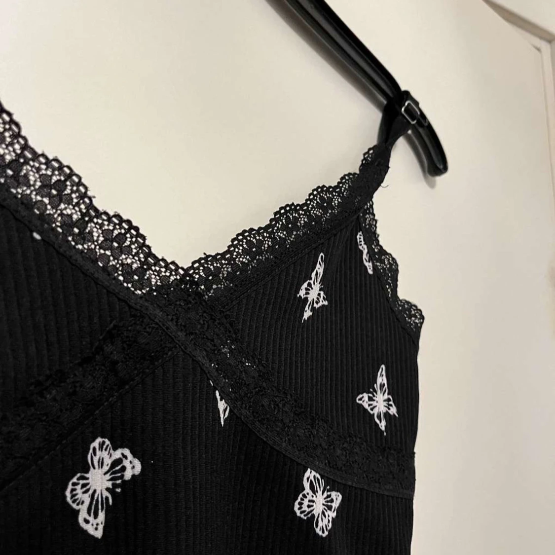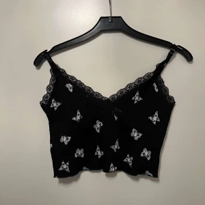Säljer ett svart linne med vita fjärilar och spetsdetaljer längs kanterna.