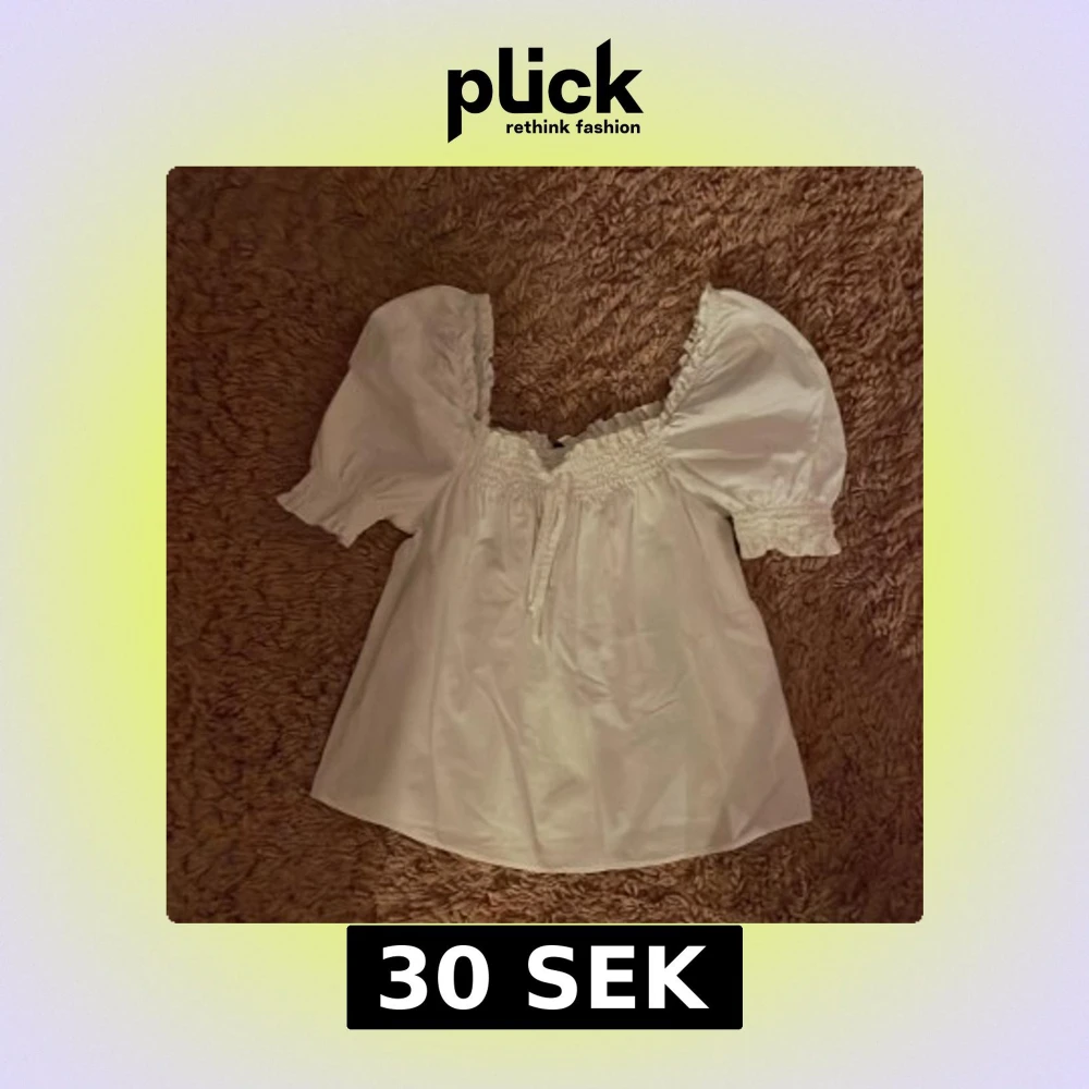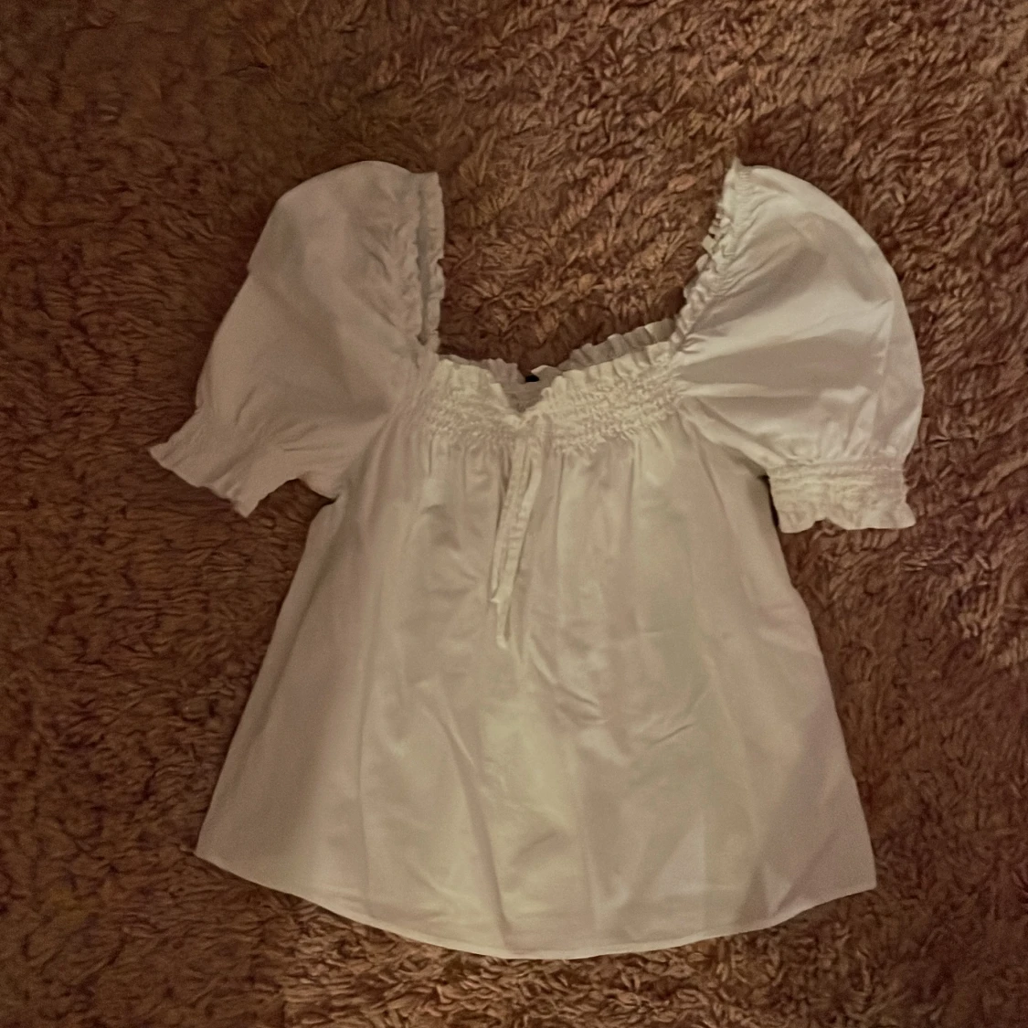 Säljer en söt vit blus med puffiga korta ärmar och smockad, rynkad urringning. Blusen har en lätt volangkant vid halsen och är tillverkad i ett mjukt, tunt tyg som känns luftigt. Perfekt för dig som gillar romantisk och trendig stil.