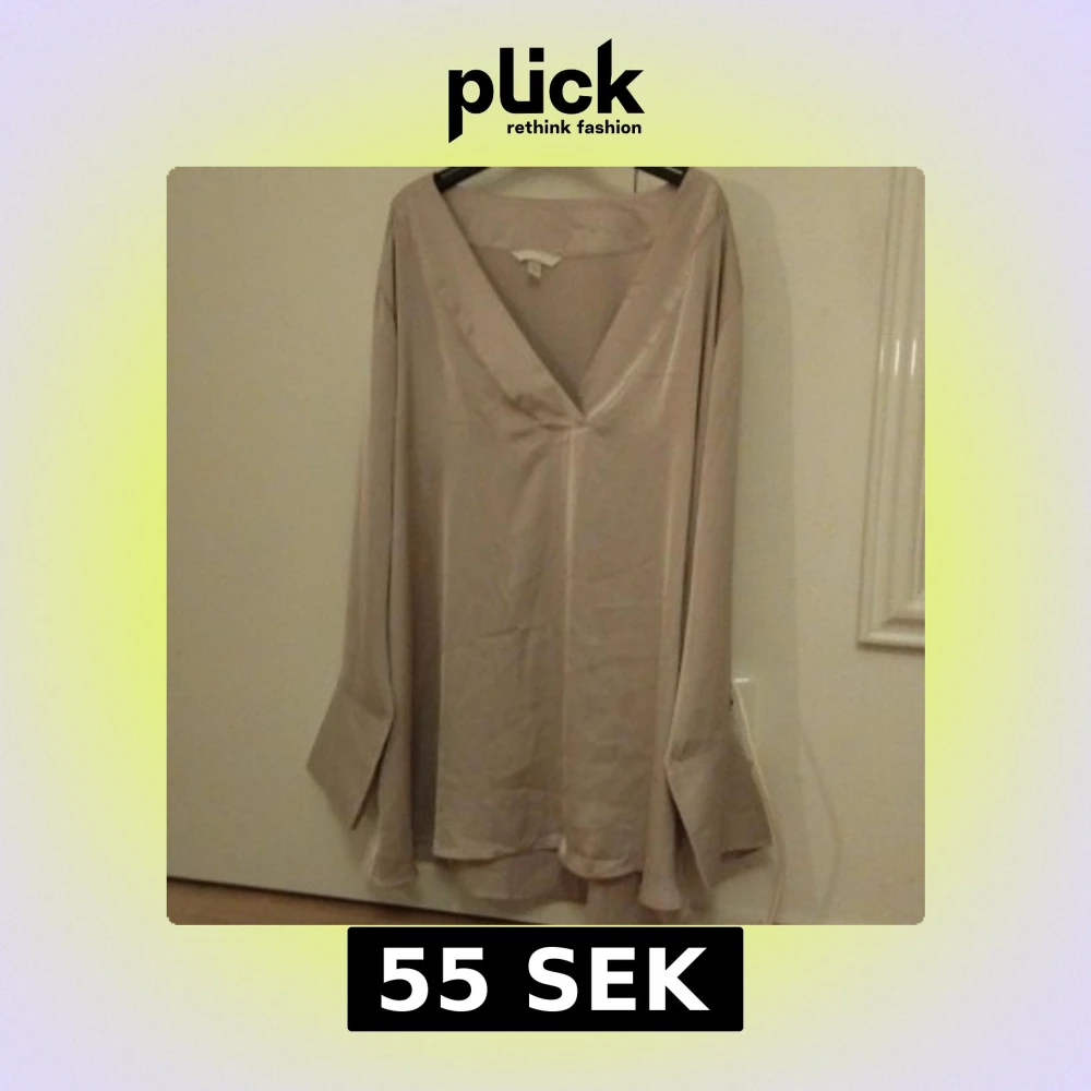 Säljer en lyxig beige blus från H&M i storlek XXL. Blusen har en djup v-ringning, långa vida ärmar och är tillverkad i glansigt sidenmaterial som ger en elegant känsla. Perfekt för dig som gillar oversized och flowy stil.