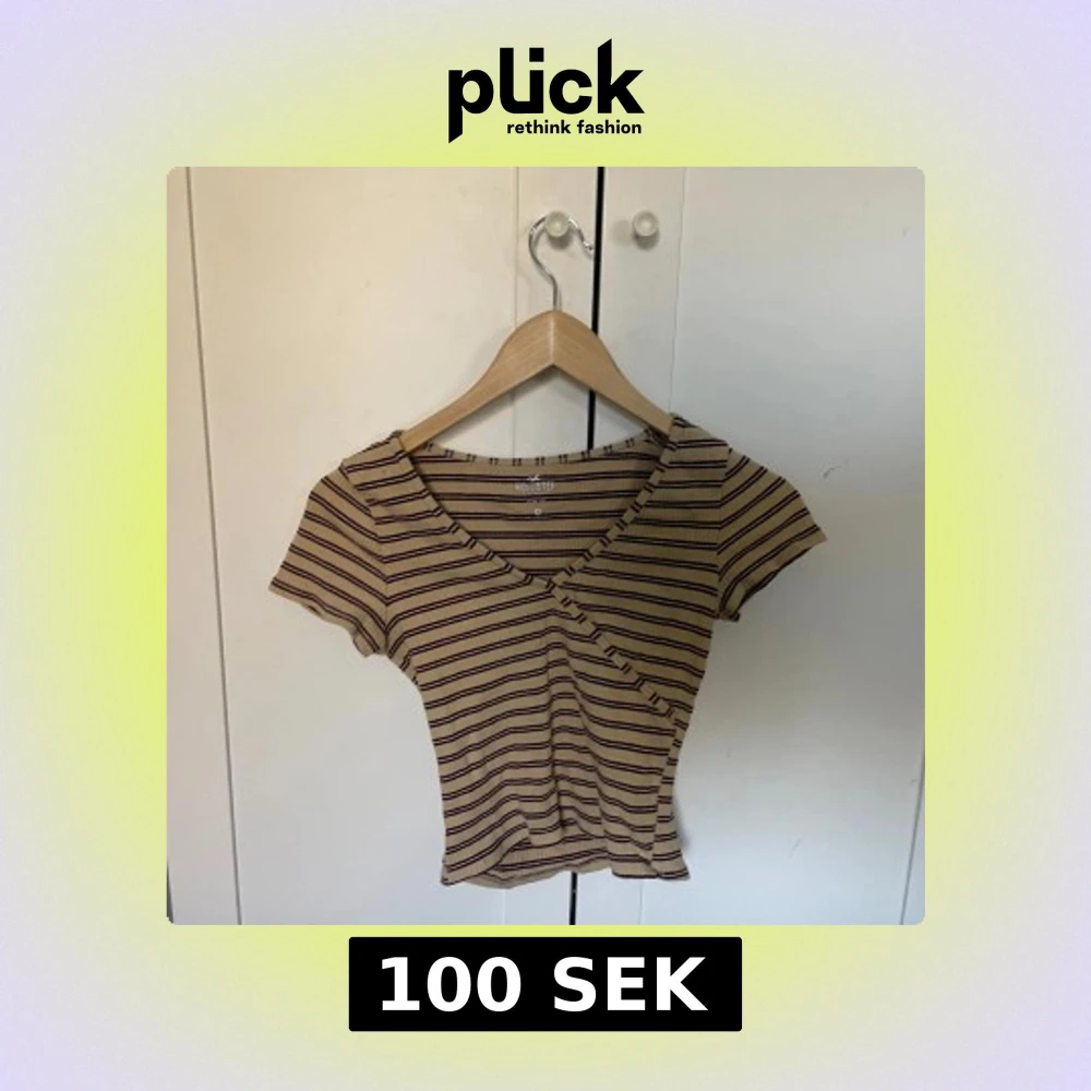 Säljer en beige och vinröd randig ribbad topp från Hollister. Toppen har en v-ringad design och korta ärmar, perfekt för en avslappnad stil. Den är i en slim passform och har en omlott-look framtill.