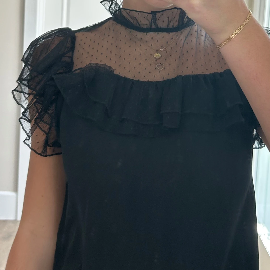 Säljer en svart blus med transparent mesh upptill och små prickar. Blusen har volangdetaljer vid axlar och hals, samt en hög krage med rynk. Använd en gång. Obs, smuts på spegeln inte tröjan!