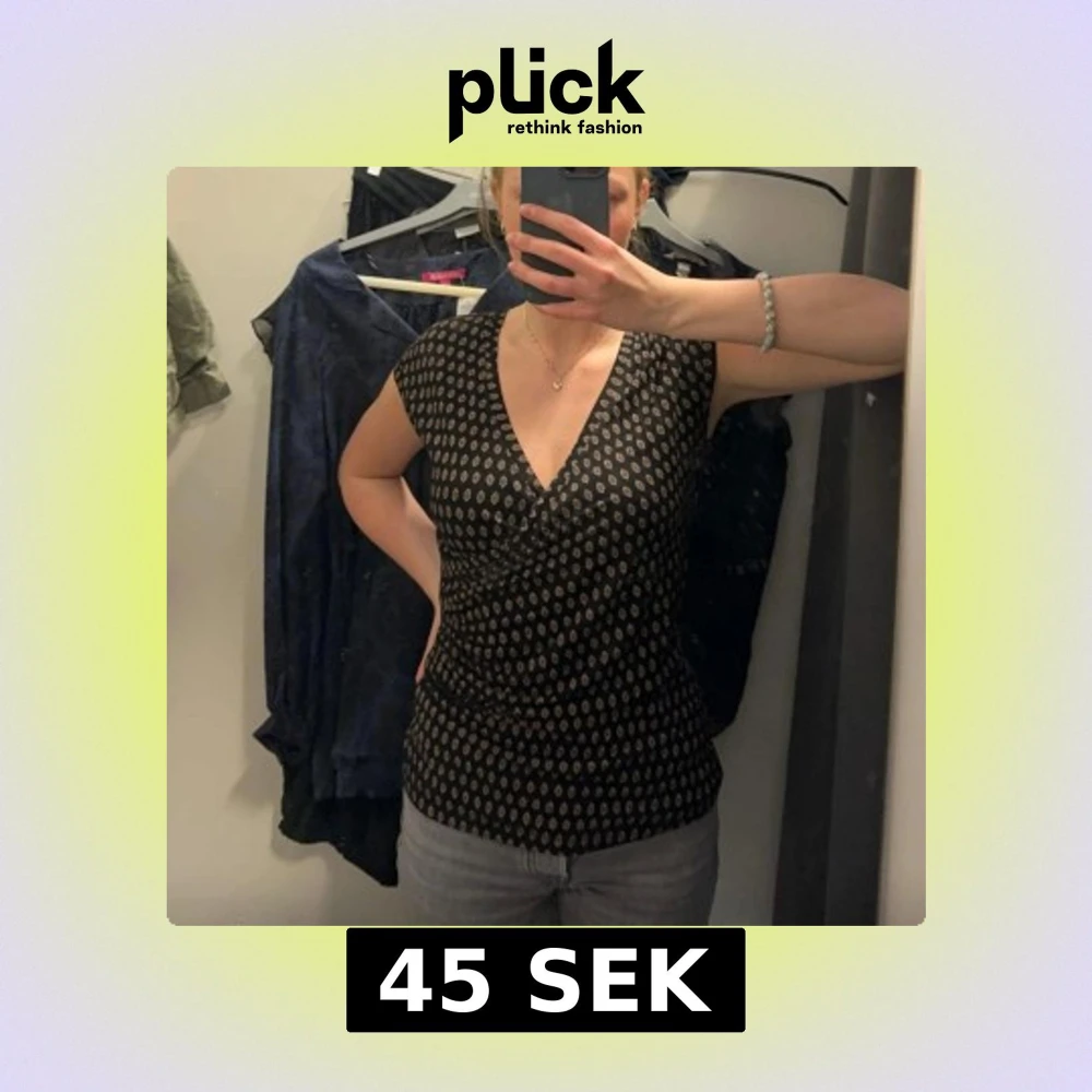 Snygg svart omlottopp med ett diskret mönster i beige. Toppen har en v-ringad design och är ärmlös, vilket gör den perfekt för varmare dagar. Passar bra till både jeans och kjol.