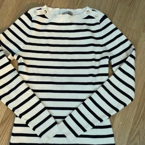 Nu säljer jag denna oanvända tröja från HM, svartvit randig med superfina guldknappar som går att spänna upp (finns en extra)🪩😇💓