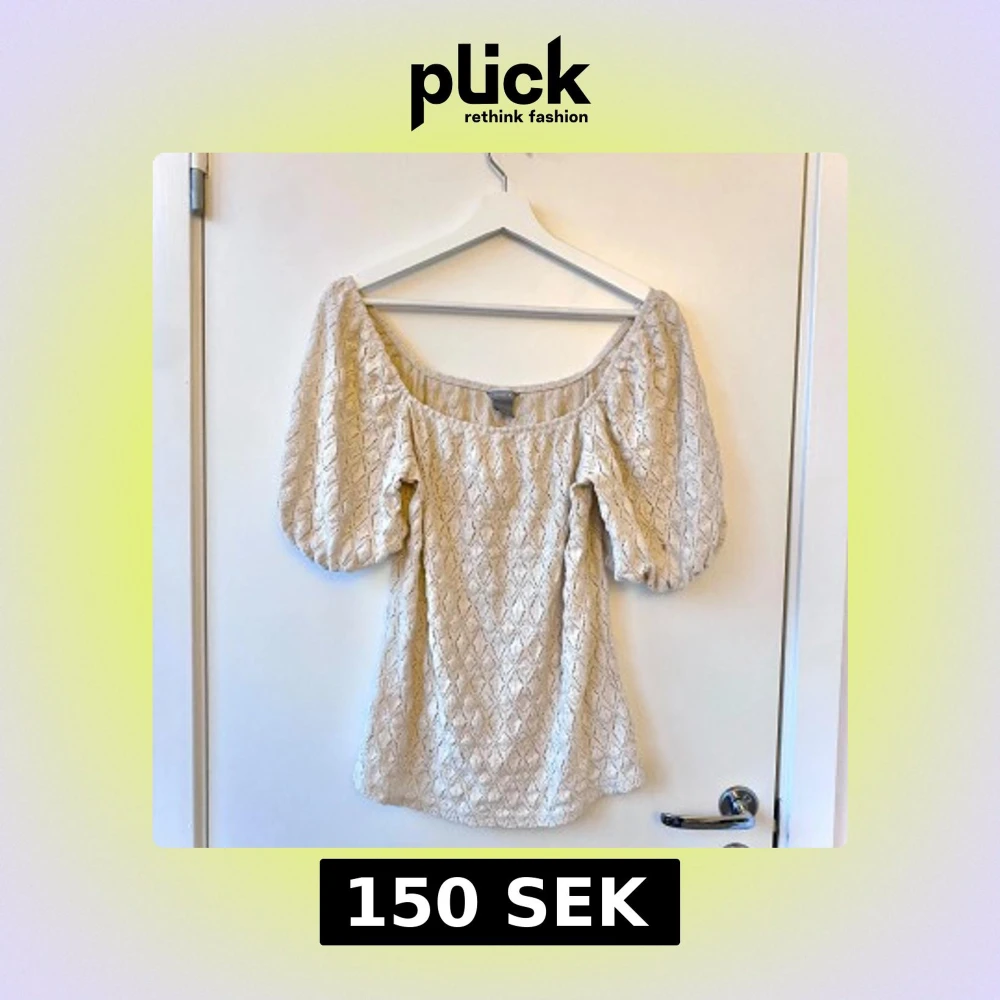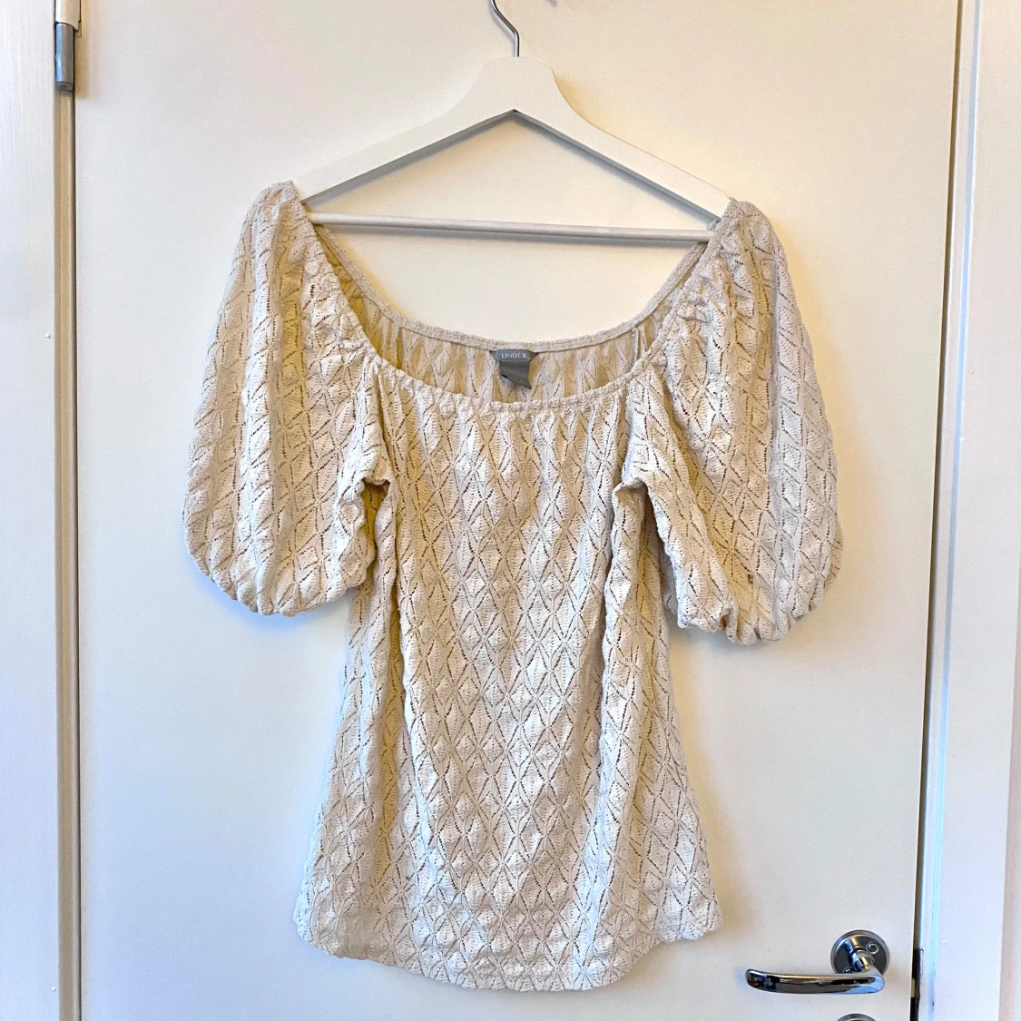 Säljer en söt beige blus från Lindex med puffiga kortärmar och ett fint spetsmönster🌸passar stl S/M