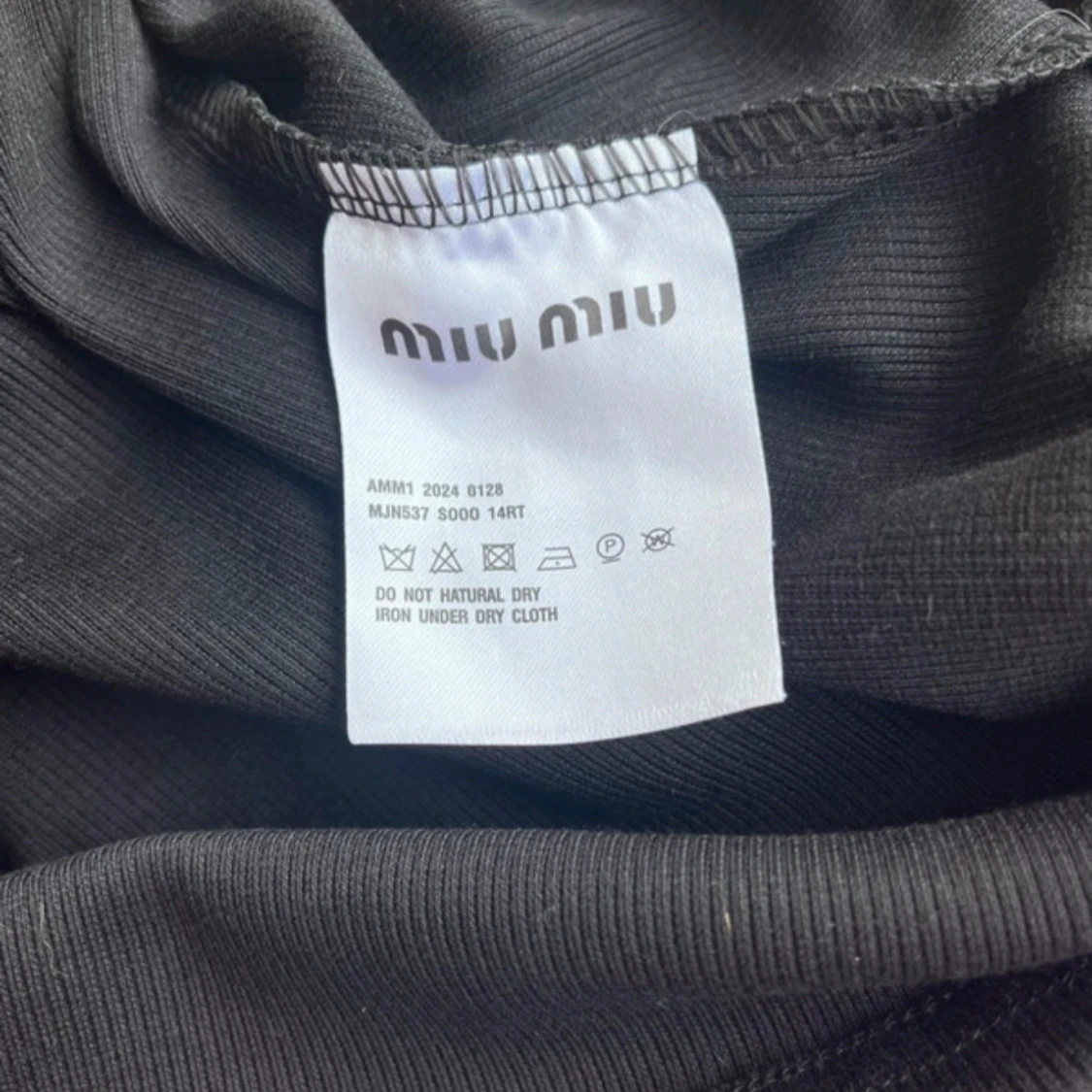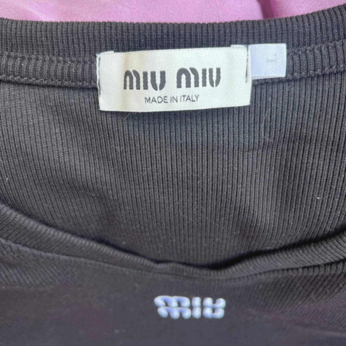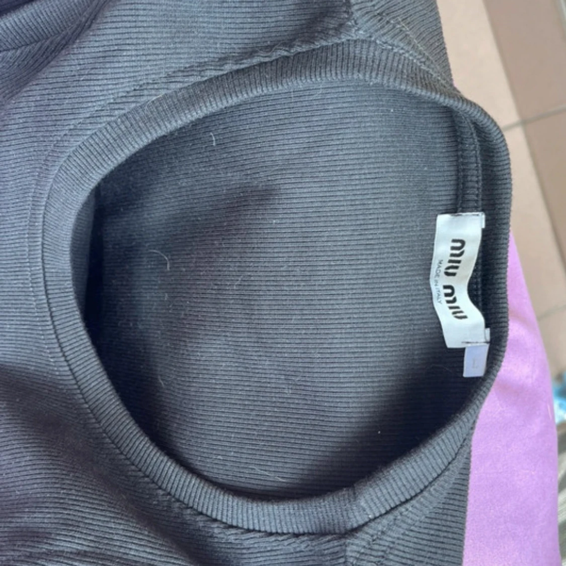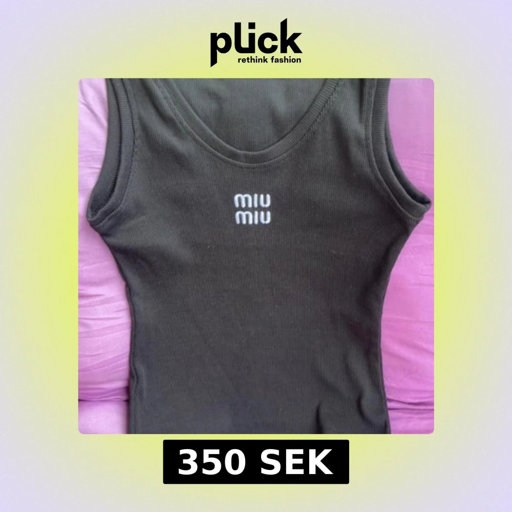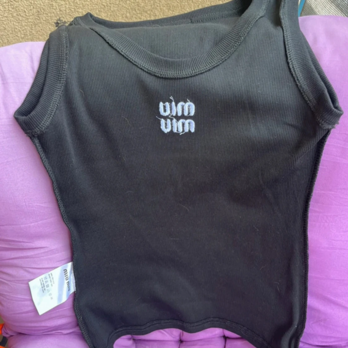 Svart ribbad linnetopp från Miu Miu med broderad logga framtill. Modellen är ärmlös med rund halsringning och har en slim passform. Materialet är mjuk bomull som känns skönt mot huden. Perfekt för dig som gillar stilrena och lyxiga basics. Köpt härinne för 500 kronor vet inte om den är äkta. Storlek L men skulle säga den passar en S