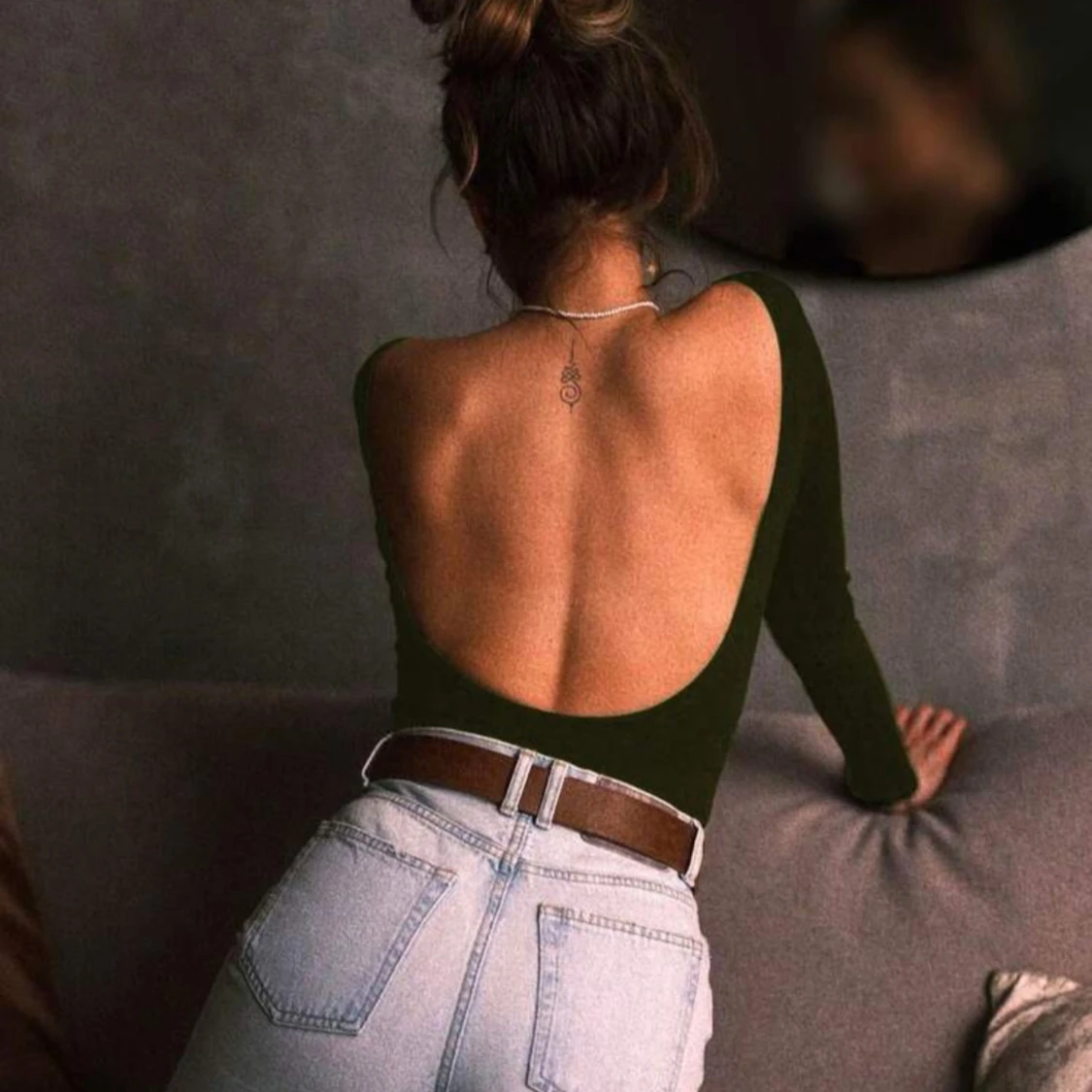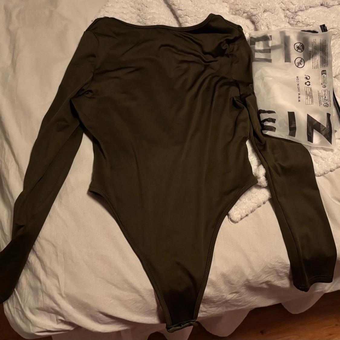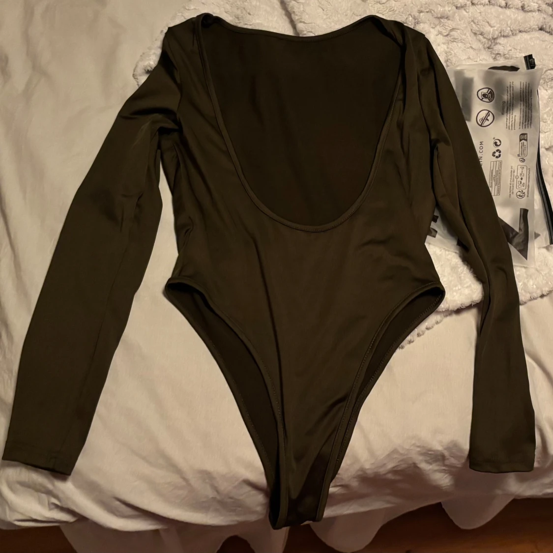 Snygg olivgrön bodysuit med långa ärmar och djup urringning på ryggen. Storlek L. Säljs den för bodyn passar ej mig