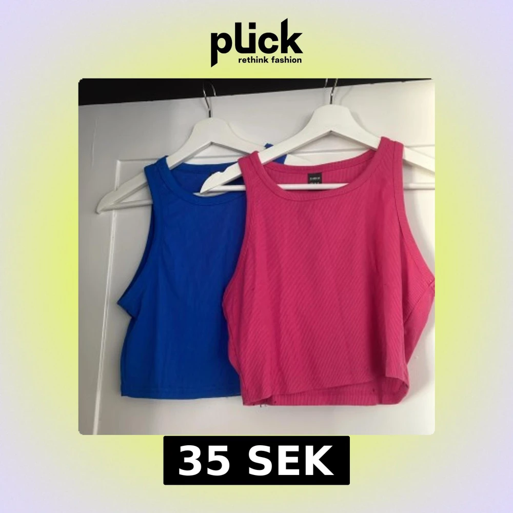 Två croppade linnen från SHEIN i storlek L, ett i starkt rosa och ett i klarblått. Båda är ribbade och ärmlösa. Båda för 35kr
