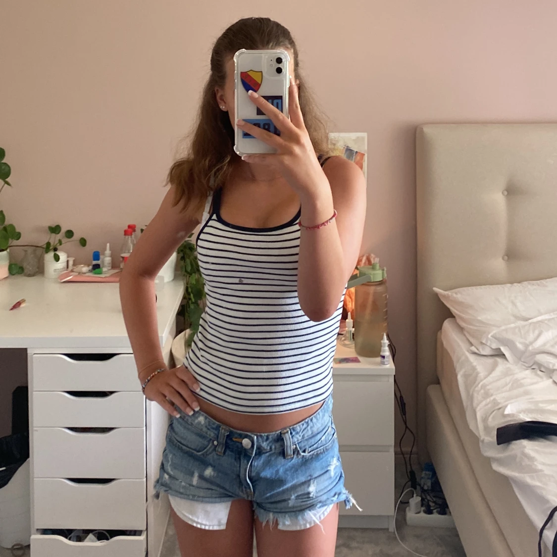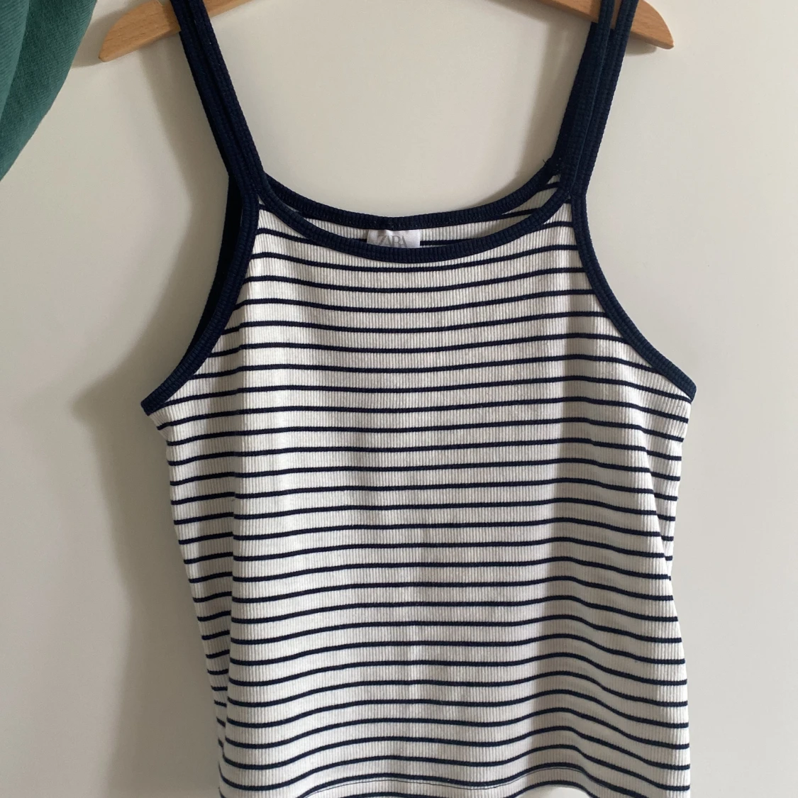 Jättegulligt linne med mörkblå och vita ränder från zara. Det är i barn storlek men passar som xs 🩷🩷Inga tecken på användning 💞