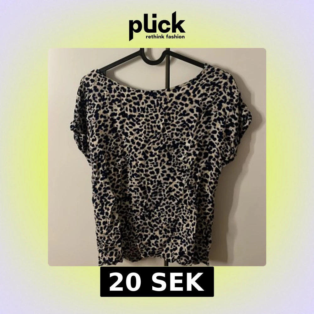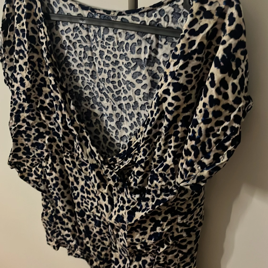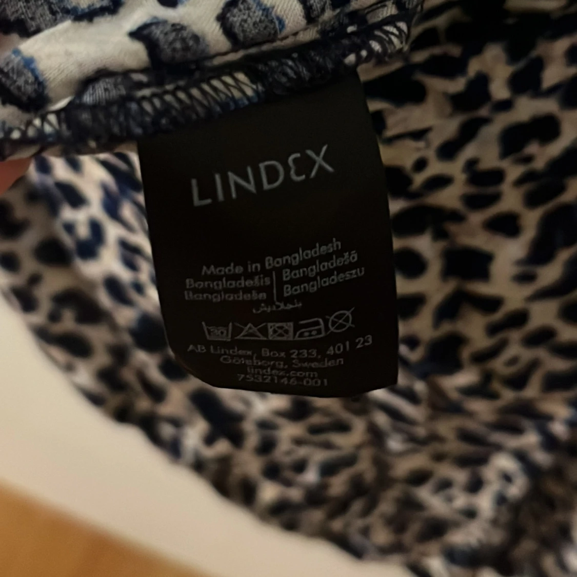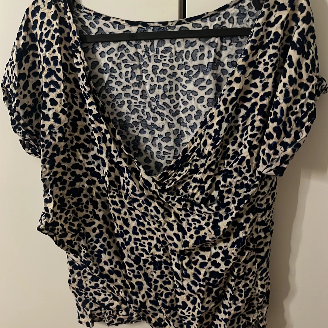Säljer en snygg blus från Lindex med leopardmönster i mörkblått och beige. Blusen har korta ärmar och en omlott v-ringning back, som ger en cool och trendig look. Materialet är mjukt och lätt, perfekt för dig som gillar djurmönster.