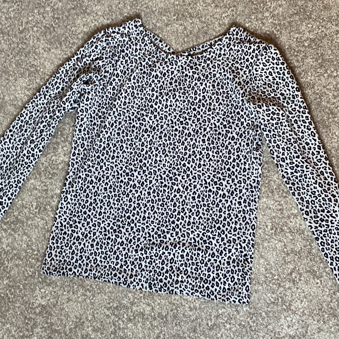 Säljer en långärmad topp med svartvitt leopardmönster och snygg detalj med öppen rygg och korsade band. Jag har klippt bort lappen, men den är från Lindex i storlek 170. Kom gärna med prisförslag!