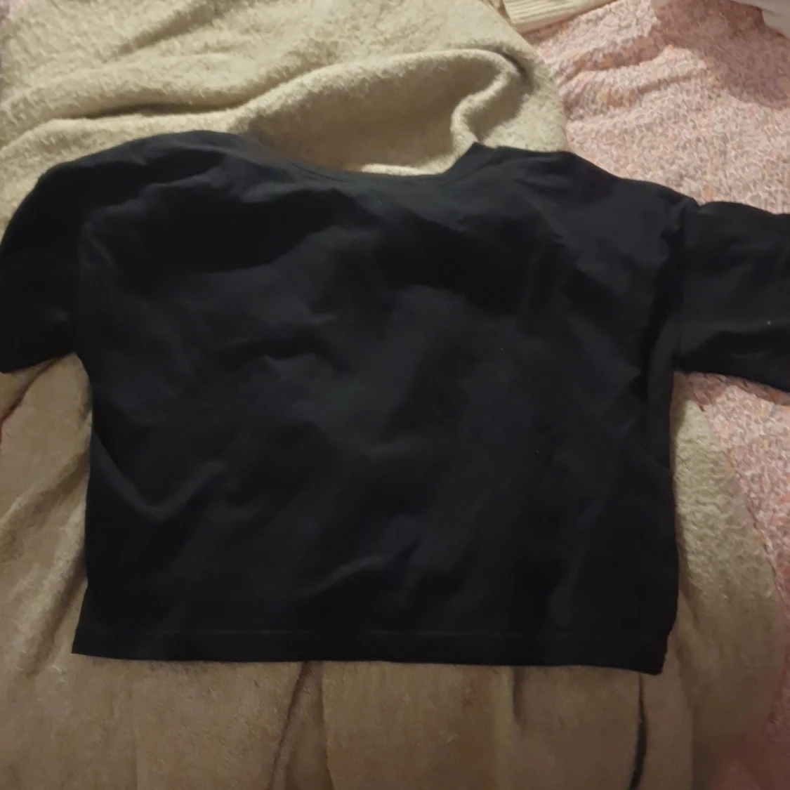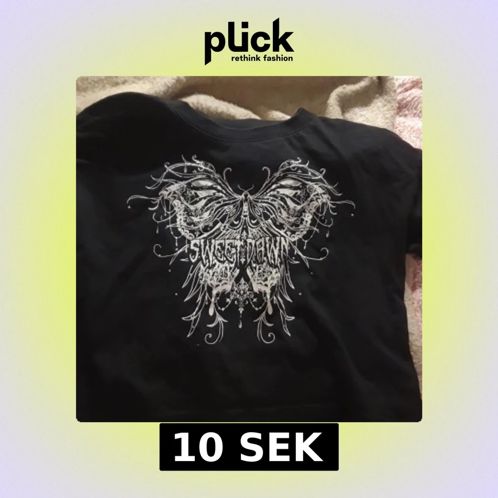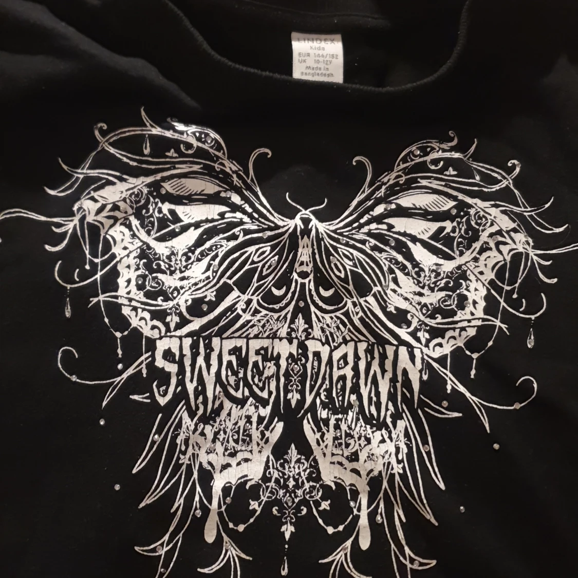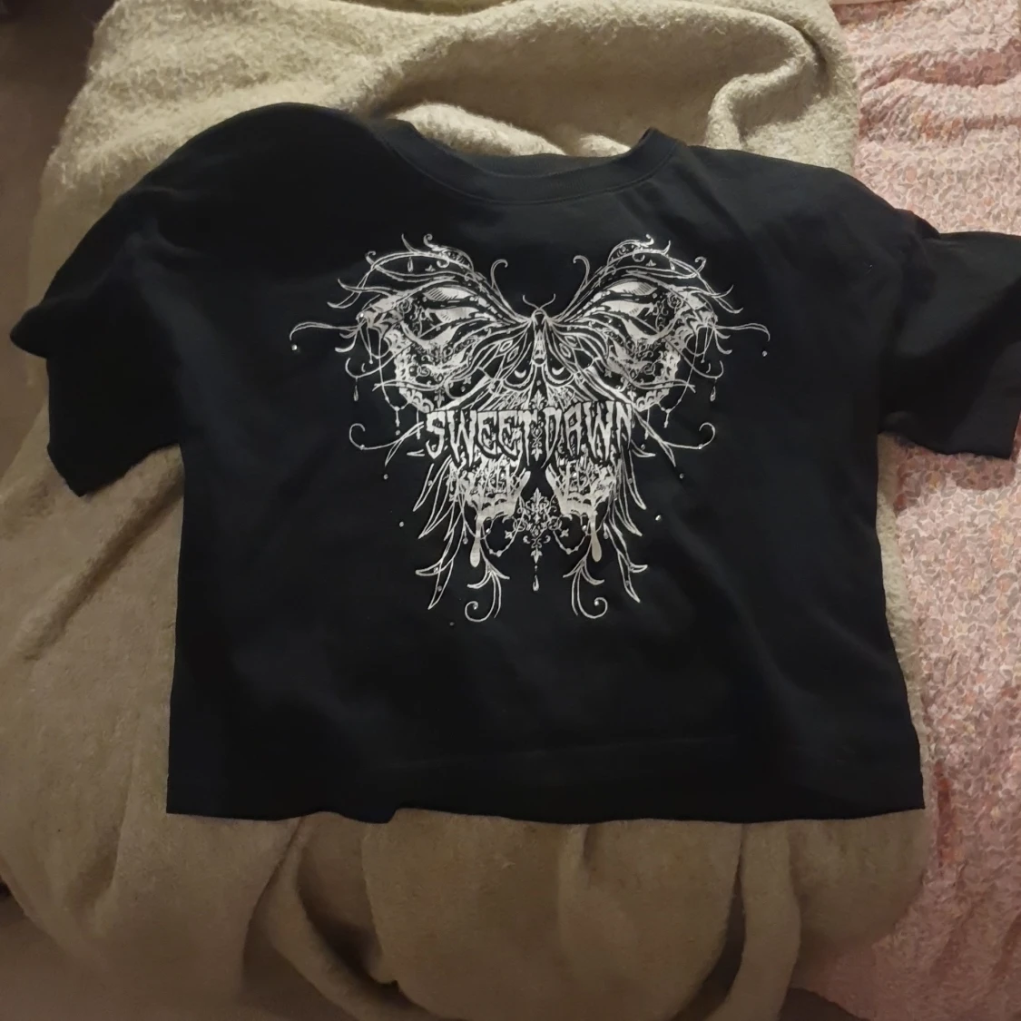 Cool svart croppad topp från Lindex med stort vitt tryck framtill som föreställer fjärilsvingar och texten 'SWEET DAWN'. T-shirten har korta ärmar och rund halsringning. Perfekt för dig som gillar edgy och unik stil.