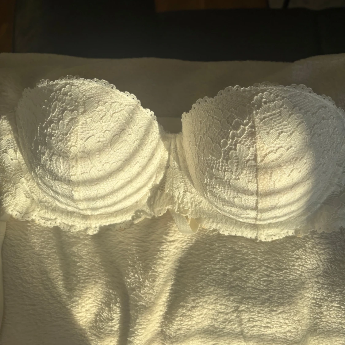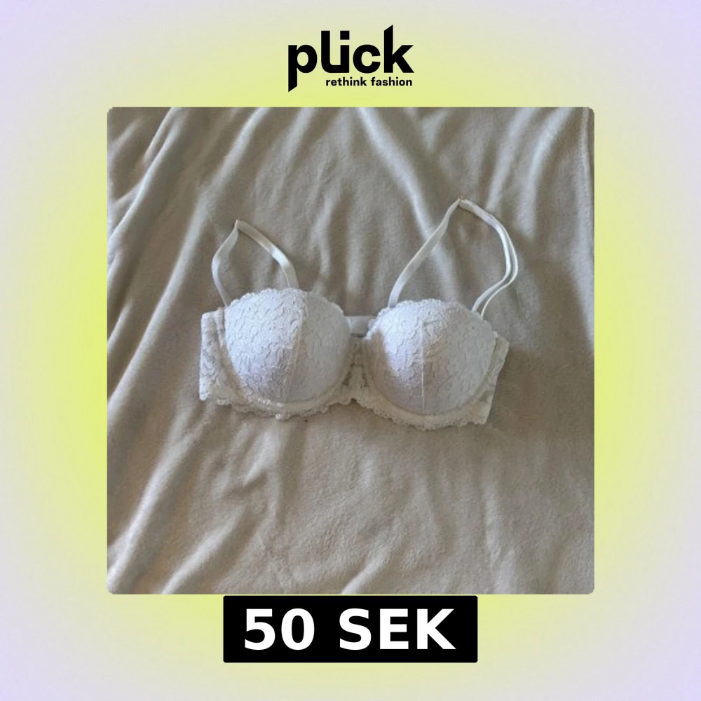 Säljer en vit bh från Lindex i storlek 75C. Baksidan har hysk- och hakknäppning och spetsdetaljer längs kanterna för en extra feminin look.