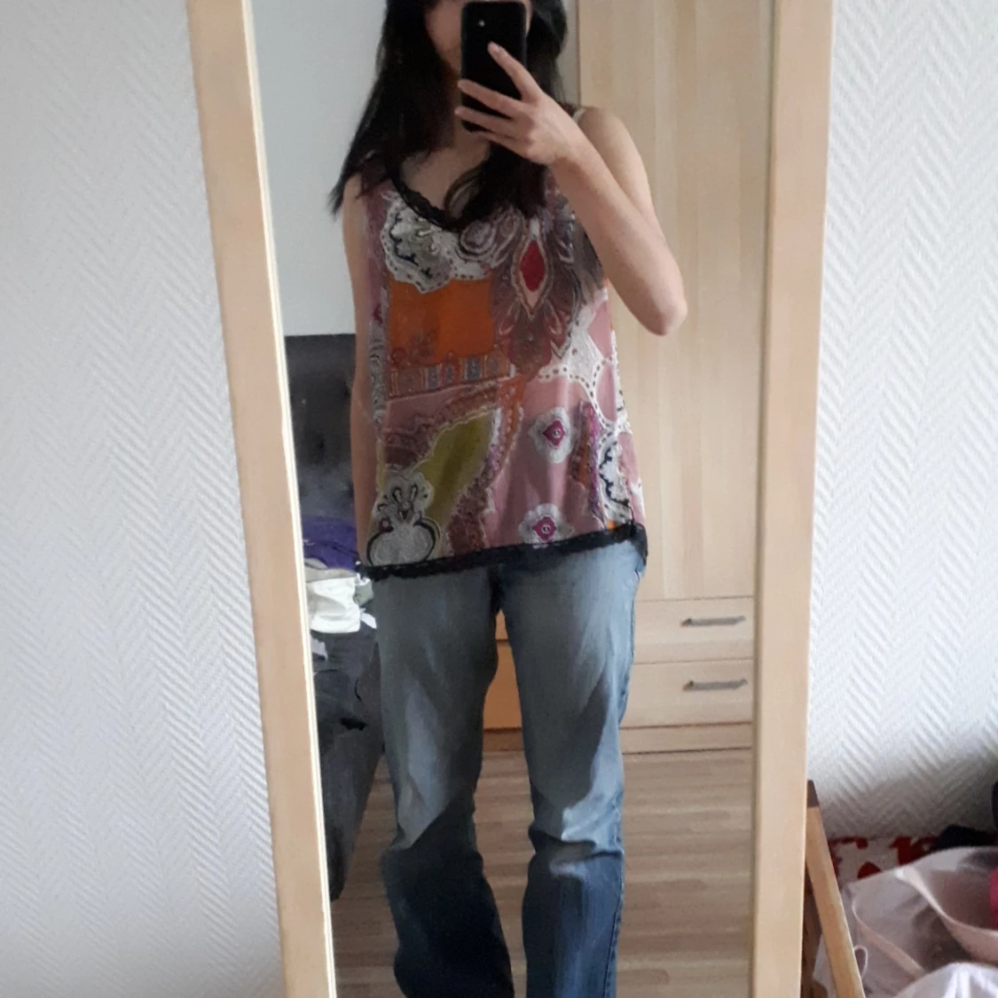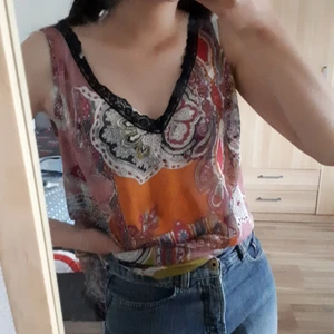 Superhärlig topp i halvgenomskinligt material (kan bära vit o svart bh under dock), lösare passform på mig som vanligvis bär S, storleken är egebtligen M🖤