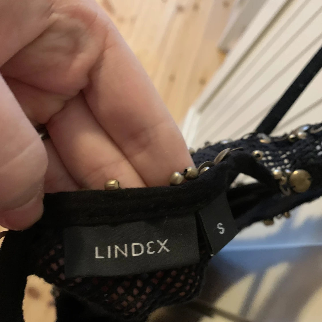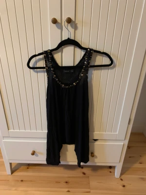 Svart linne med nät i ryggen och med paljetter av något slag. Storlek S