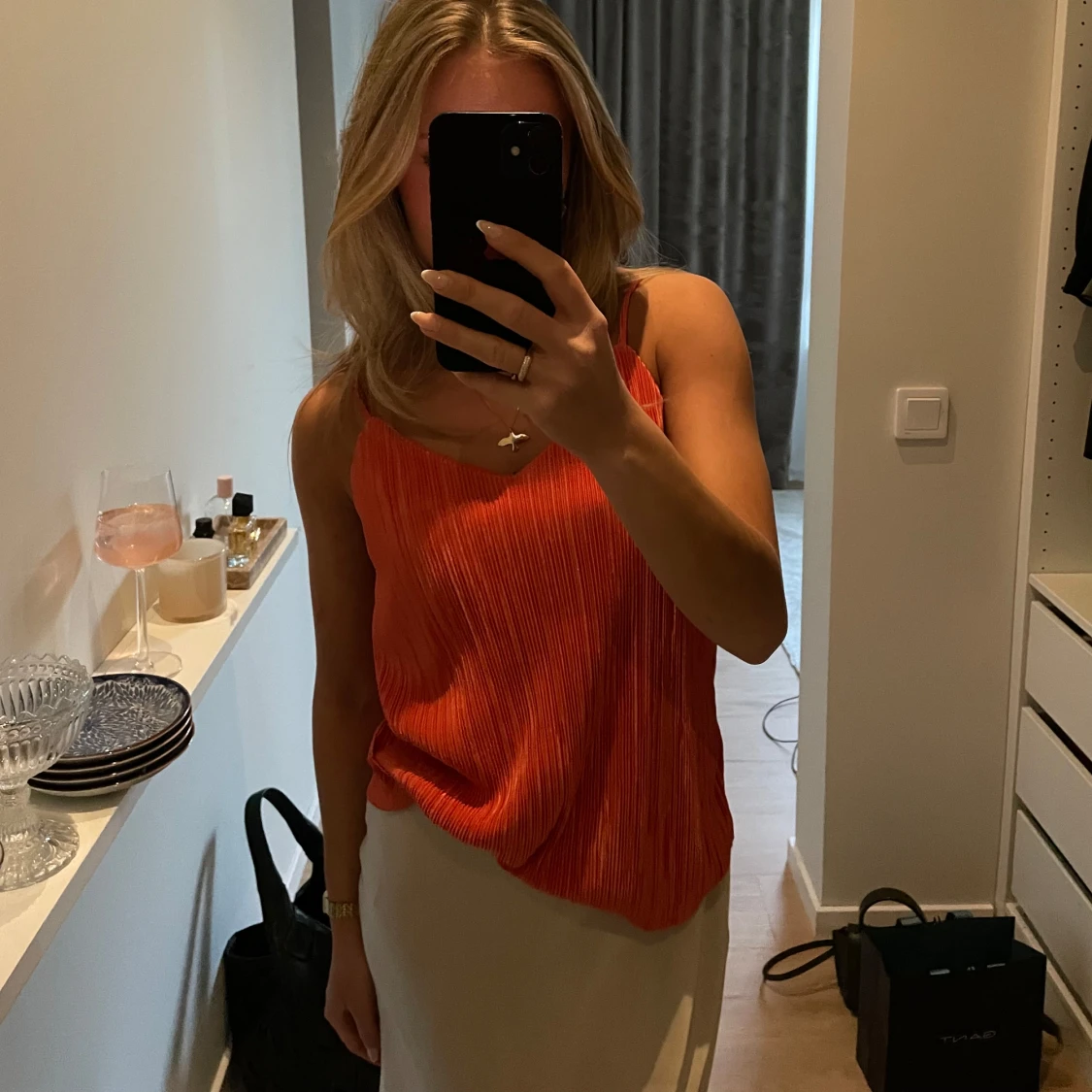Säljer en snygg orange linnetopp med ribbad struktur och smala axelband. Perfekt för varma dagar och enkel att matcha med olika underdelar.