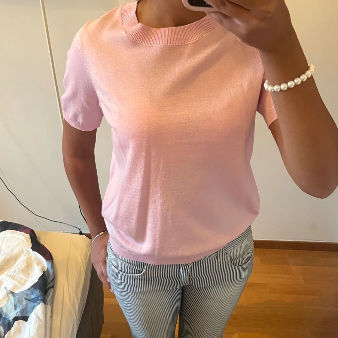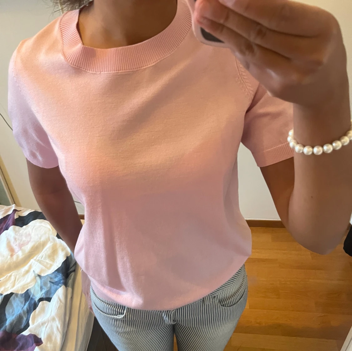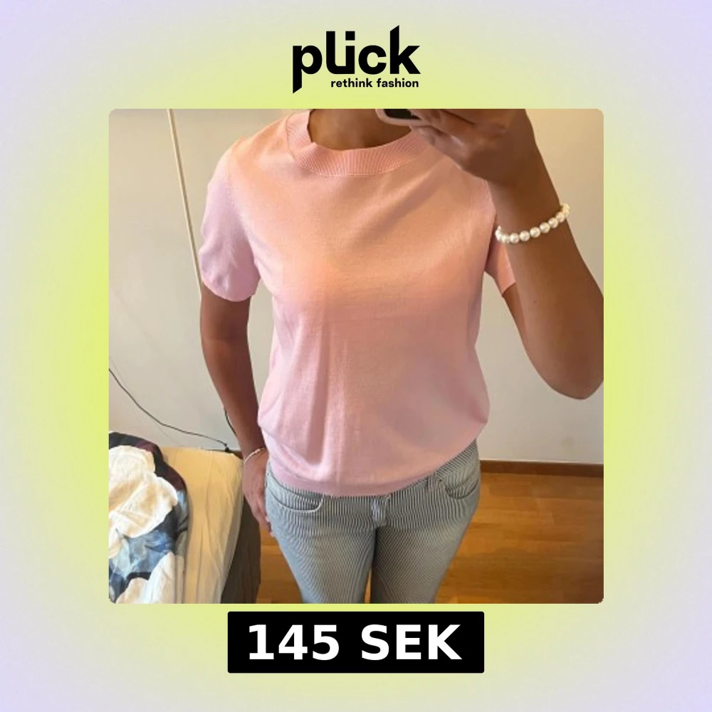 Supersöt ljusrosa stickad topp från Lindex med korta ärmar och ribbad rund halsringning.
