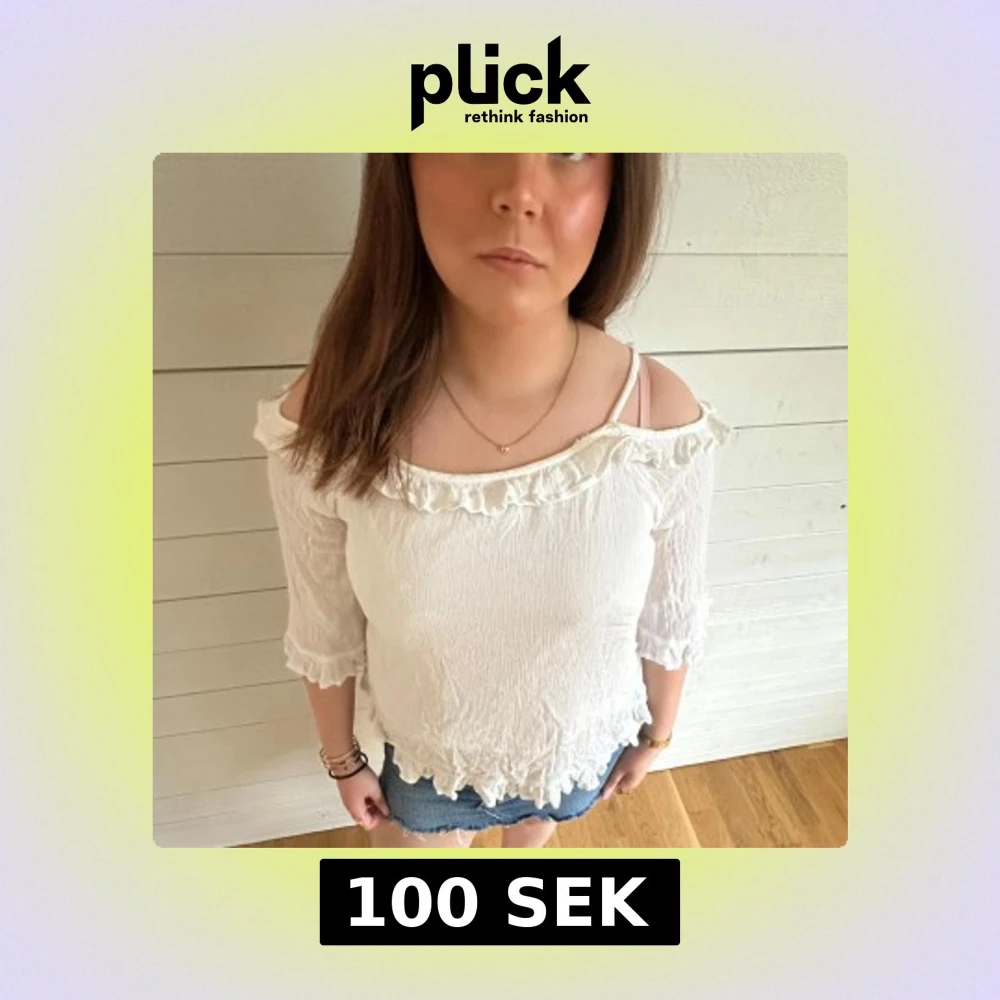 Säljer en söt vit offshoulder blus med volangdetaljer längs halsringningen och nederkanten. Blusen har trekvartsärm och är tillverkad i ett lätt, krinklat material som ger en avslappnad känsla.