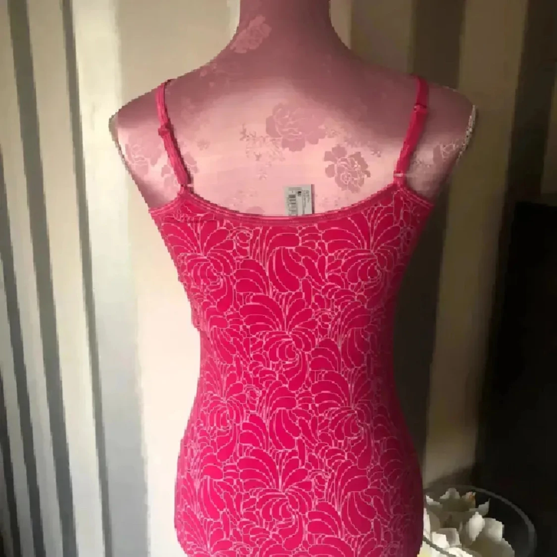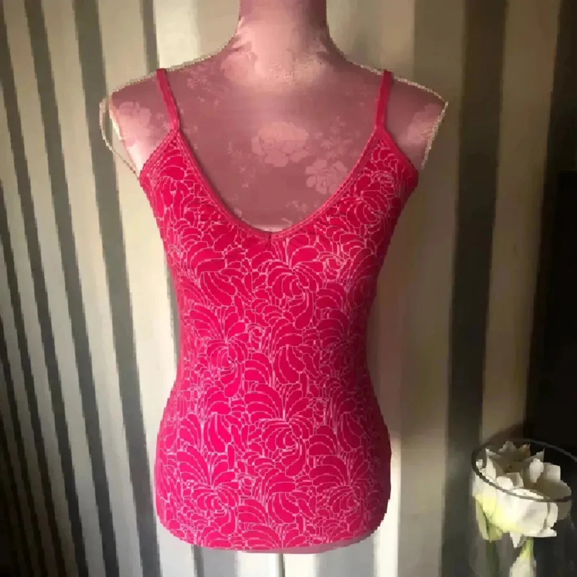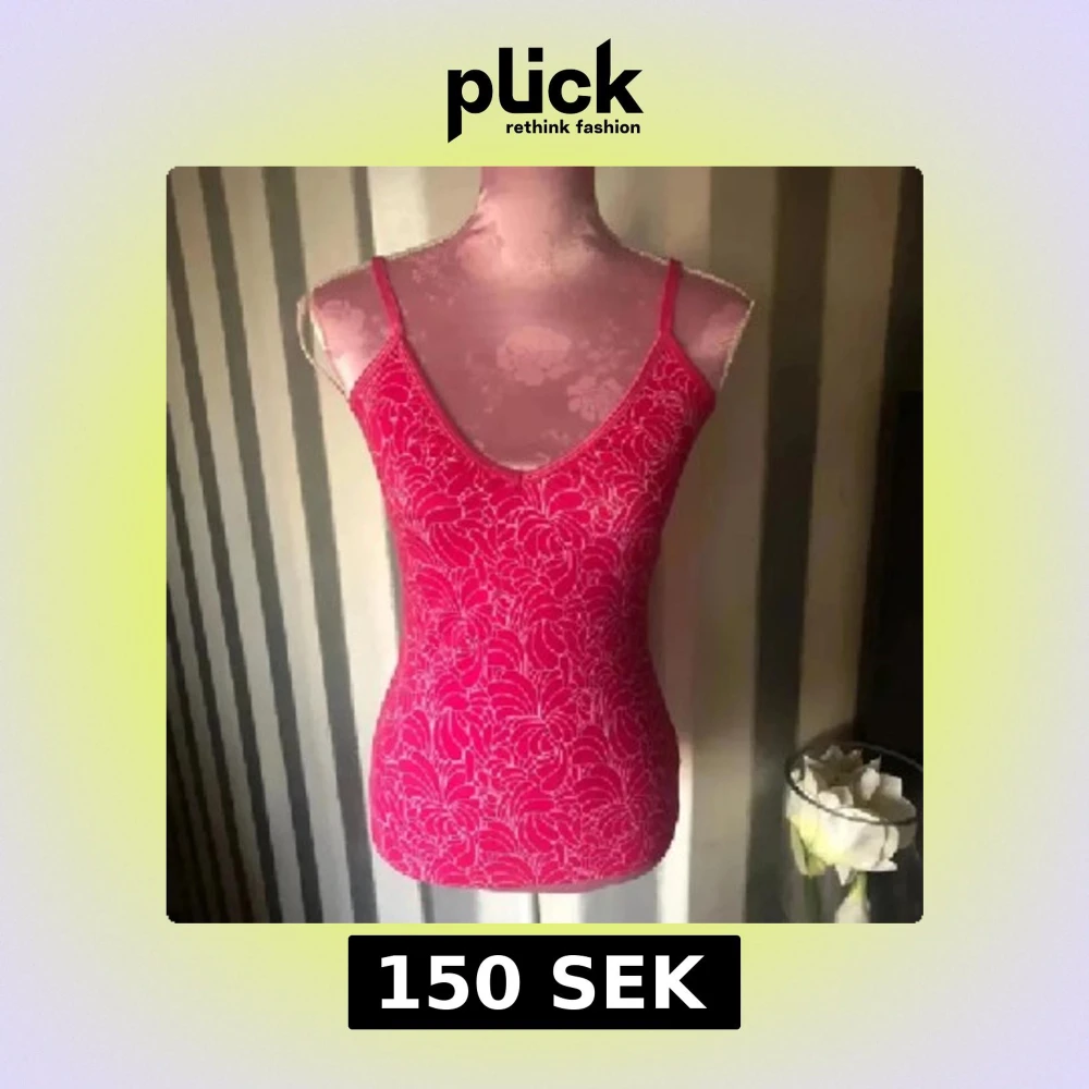 Snygg rosa linnetopp med blommigt mönster och smala axelband. Toppen har en v-ringad hals och är figurnära i modellen. Perfekt för dig som gillar färg och vill sticka ut lite extra. Materialet känns lätt och bekvämt mot huden. Inbyggd bh. Storlek m men lite mindre i storleken