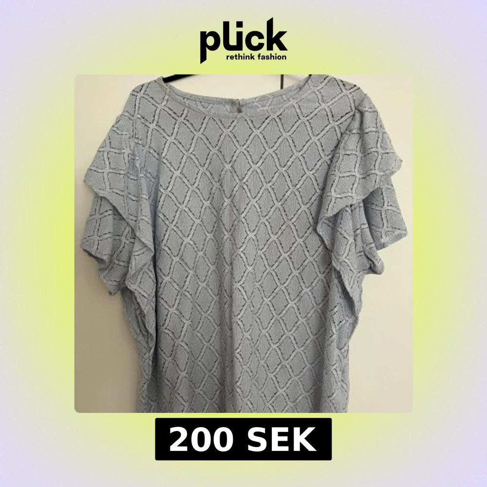 Säljer en ljusblå blus med ett elegant mönster och volangdetaljer längs ärmarna. Perfekt för en stilren look. Den är i Xl men passar S/M också