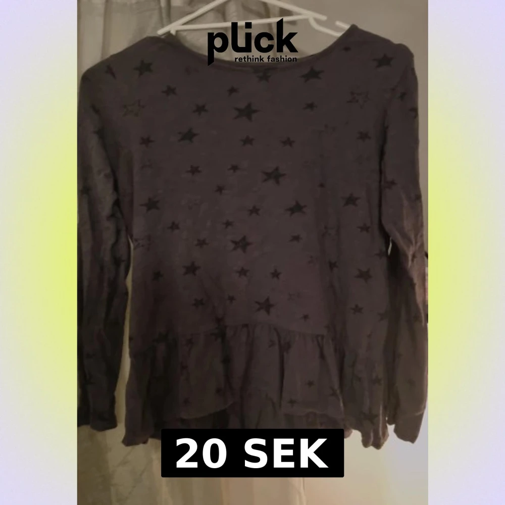 Säljer en svart blus med coolt stjärnmönster över hela tyget. Blusen har långa ärmar och en volang längst ner som ger en extra touch. Från Lindex storlek 146-152