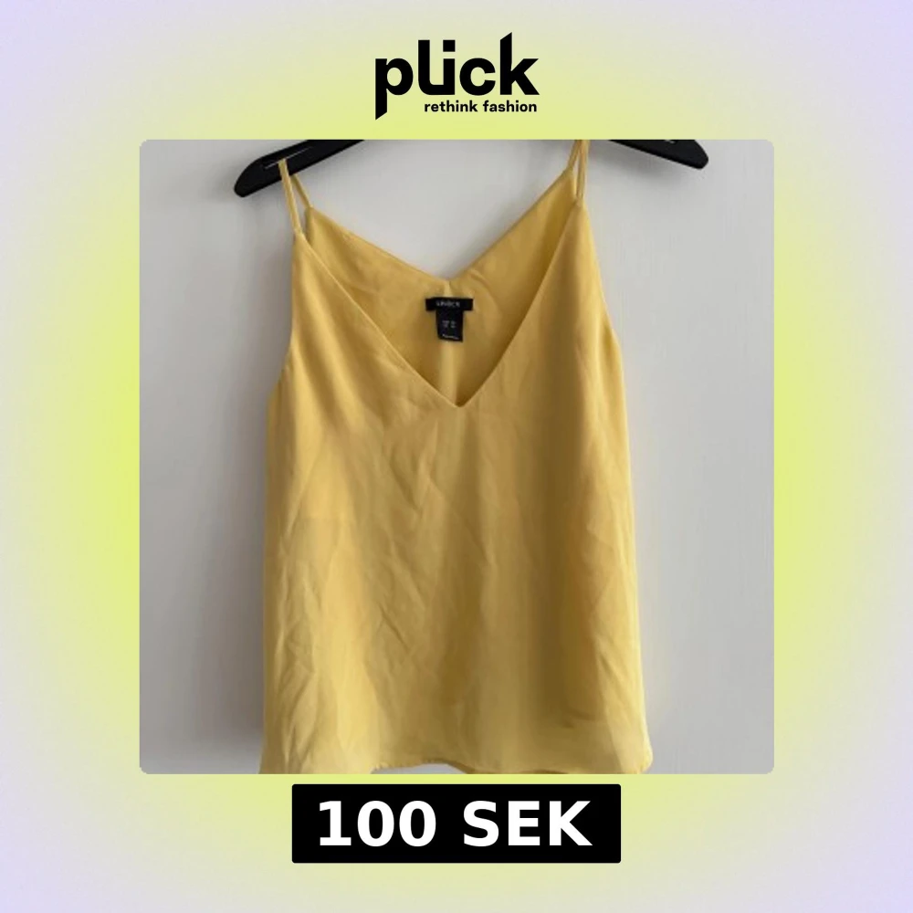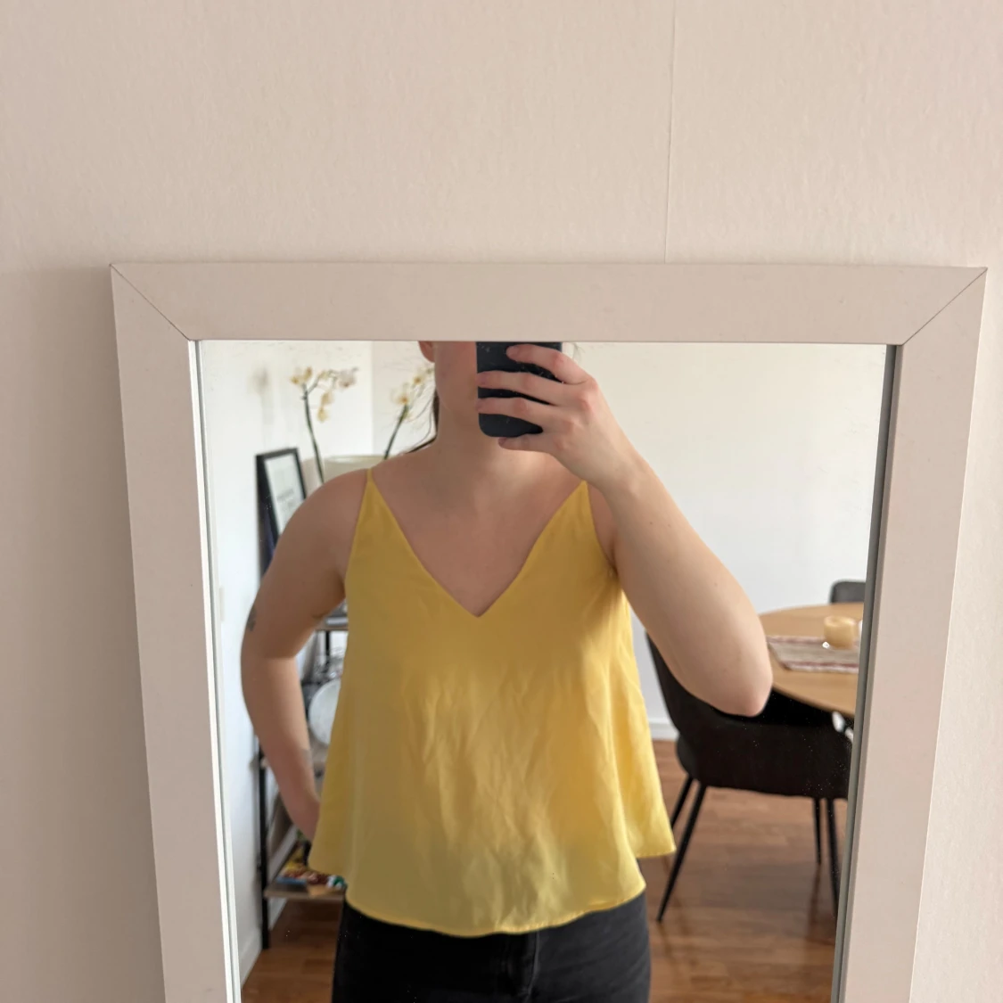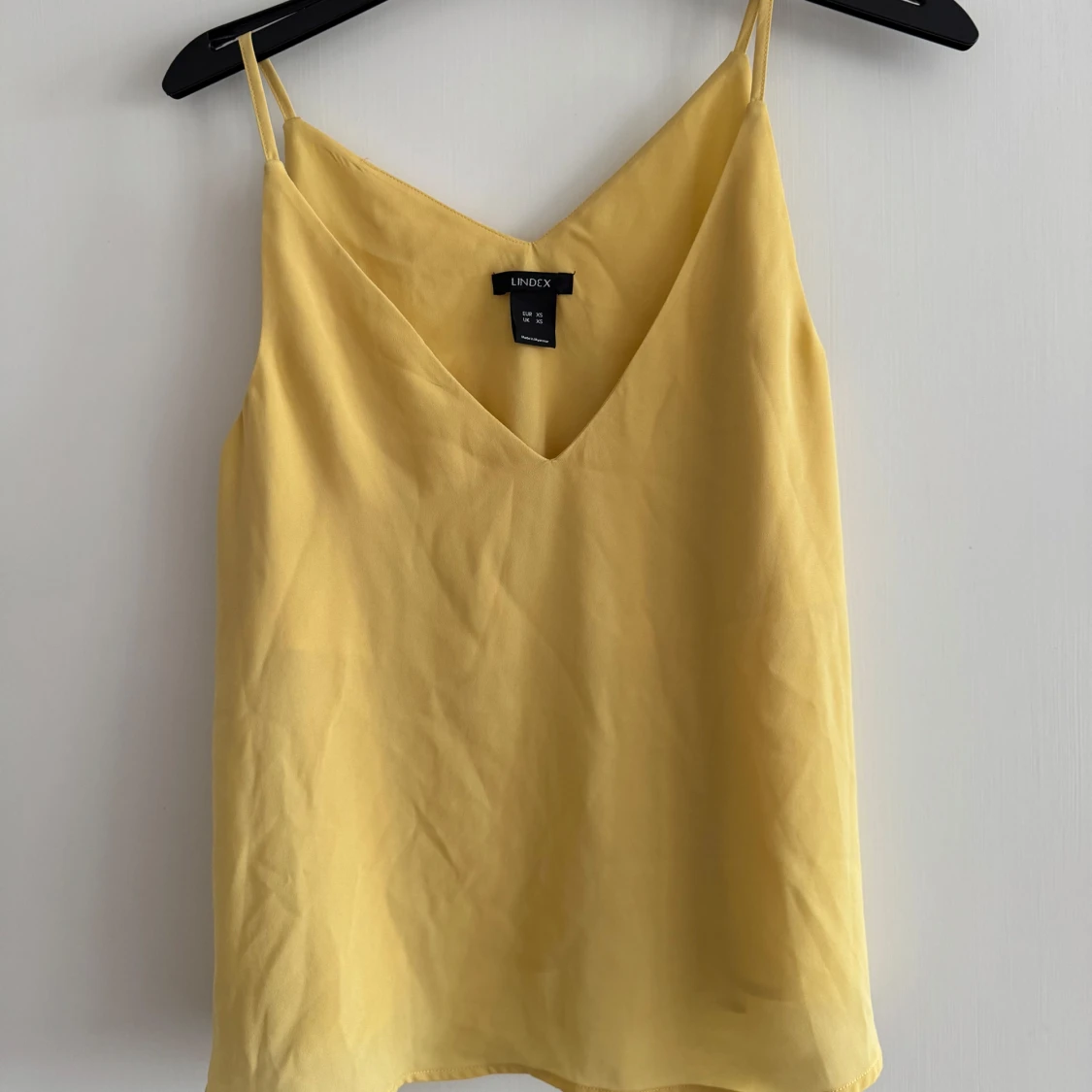Säljer en solgul linnetopp från Lindex med smala axelband och v-ringning. Perfekt för varma sommardagar. Toppen har en lös passform som ger en luftig känsla.