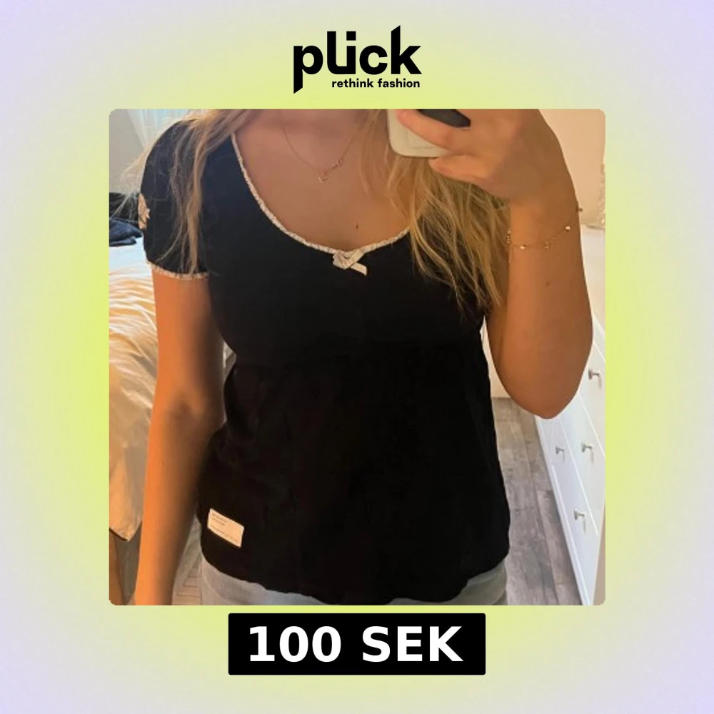 Supersöt svart topp från Odd Molly, modell Fella Top. Toppen har korta ärmar, vit spetskant runt halsringning och ärmslut samt en liten rosett framtill. På ena ärmen finns ett broderat Odd Molly-märke. Perfekt för dig som gillar feminina detaljer.