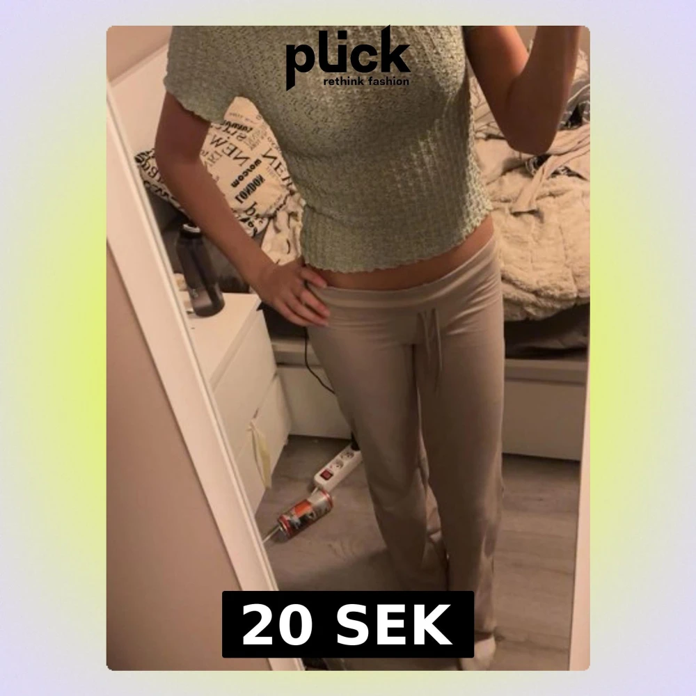 Säljer en ljusgrön topp från AWARE i storlek S. Toppen har ett ribbat, vågigt mönster och korta ärmar. Materialet är mjukt och stretchigt, perfekt för dig som gillar en bekväm och snygg stil. Den har en croppad passform med söt kantdetalj nedtill.