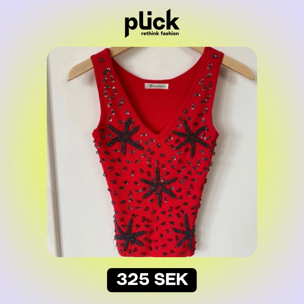 Superfin till sommaren! ☀️Passar även till fest!🙌💓En röd topp från Betsy Fashion med v-ringning och dekorerad med svarta paljetter i stjärnmönster. 🌟Toppen är ärmlös och har en tight passform.💓