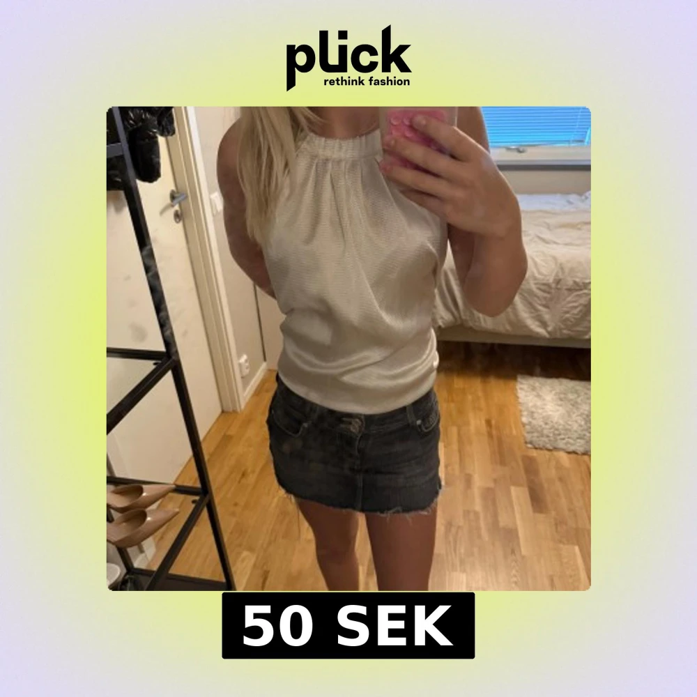 Säljer en vit blus med halterneck och lätt glansig yta. Toppen är ärmlös och har en lös passform som kan stylas både instoppad och utanför byxan. Materialet känns svalt och luftigt, perfekt för varmare dagar.