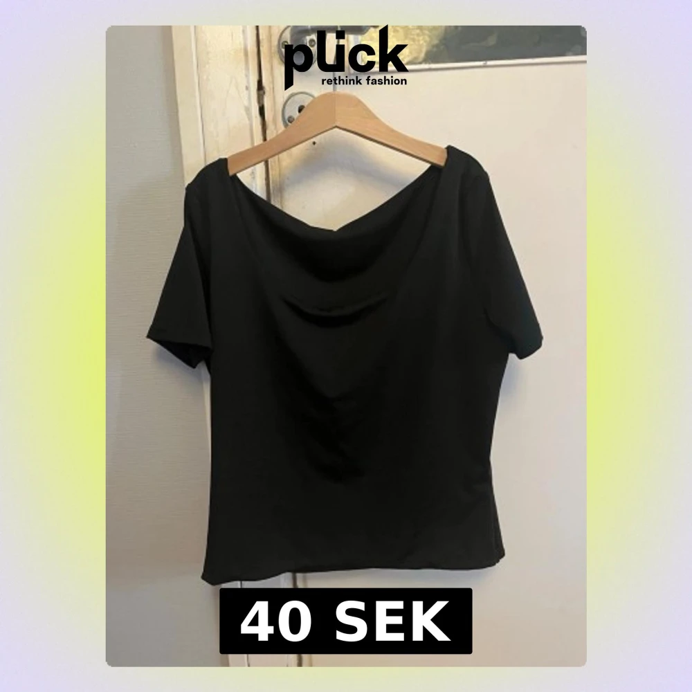 En svart topp med korta ärmar och snyggt draperad urringning. Modellen är enkel men har en cool detalj framtill som ger ett extra lyft. Passar perfekt till jeans eller kjol för en clean look.
