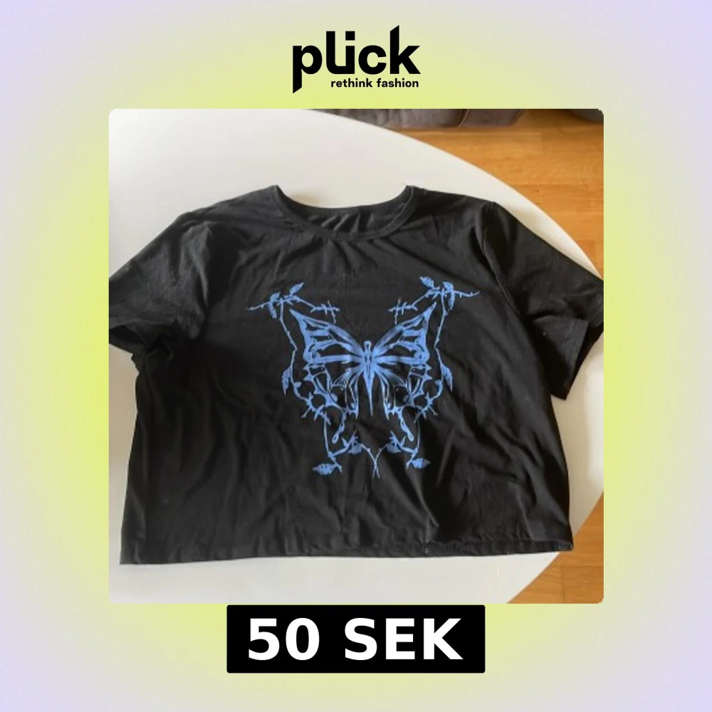 Cool svart croppad topp med ett stort blått fjärilstryck framtill. T-shirten har rund halsringning och korta ärmar. Perfekt för dig som gillar edgy och unik stil.